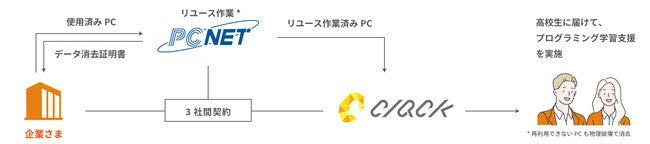 けてIT を学んでもらうプロジェクトです。当社にて情報漏えいを防ぐデータ消去、クリーニング、OS 等の再インストールを行って再生PC として製品化し、これをCLACK が経済的に困難な状況にある高校生の自走力支援を目的とした完全無料のプログラミング教室「Teck Runway」(CLACK 運営)に参加する高校生に無償でお渡ししています。