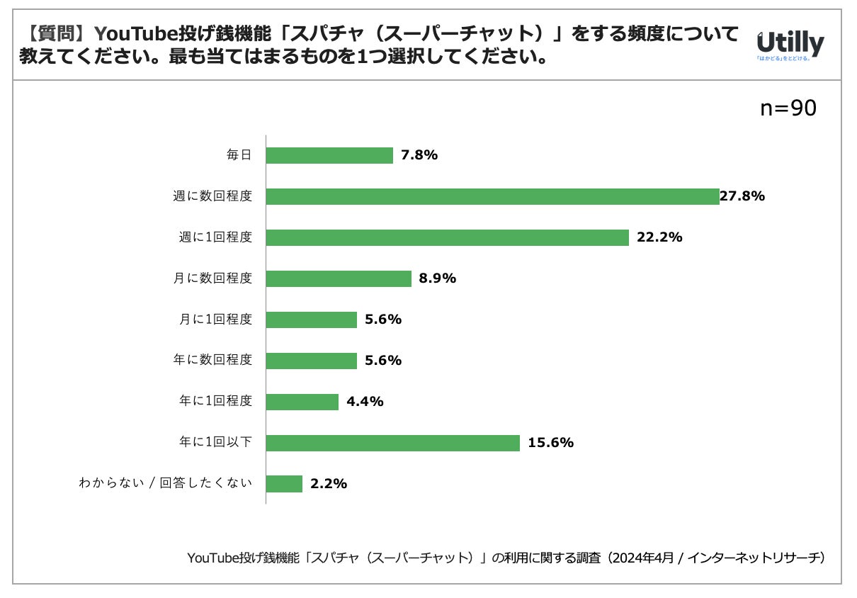 スパチャ利用者の利用頻度については週に1回〜週に数回程度が50%でボリュームゾーンとなった。一方で、7.8%は毎日投げ銭をしていると回答した。