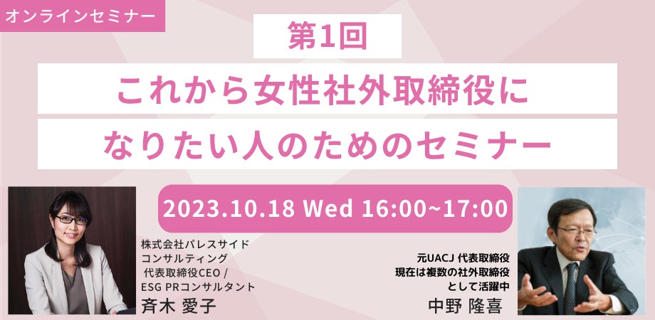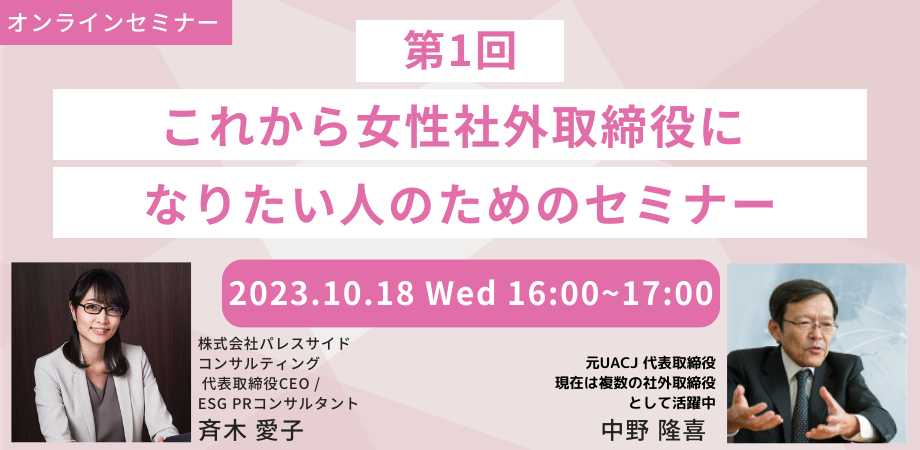 初めて社外取締役になりたい女性のために、現役で社外取締役として活躍している一流講師を招いたセミナーを開催いたします。