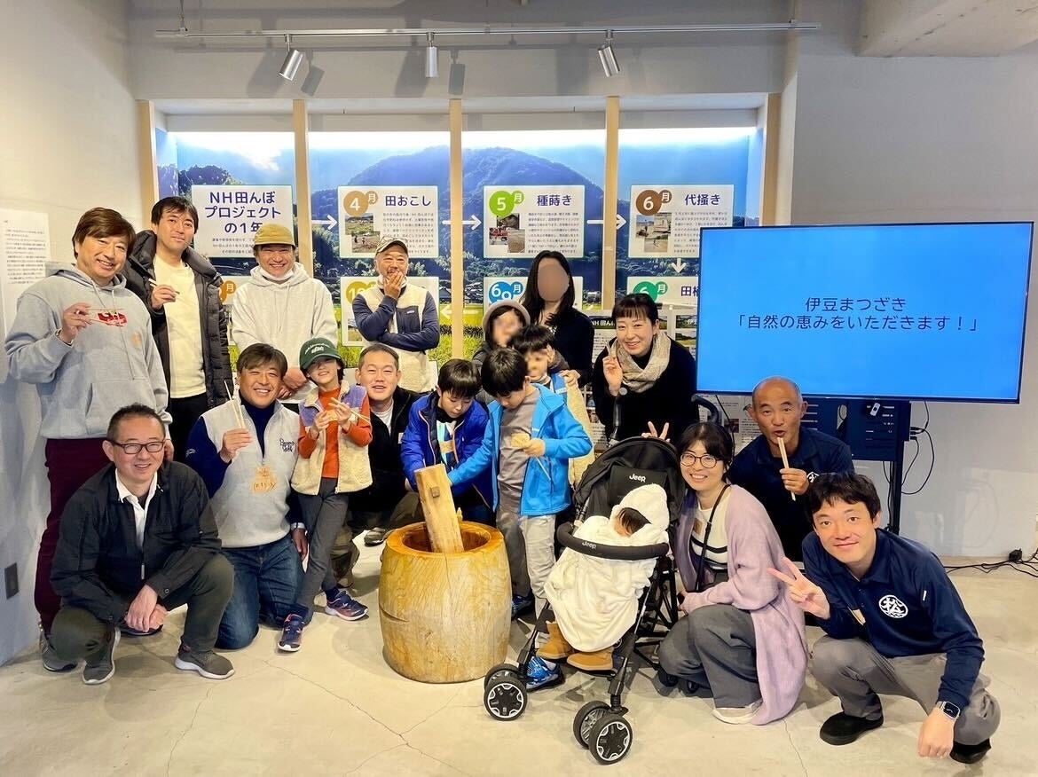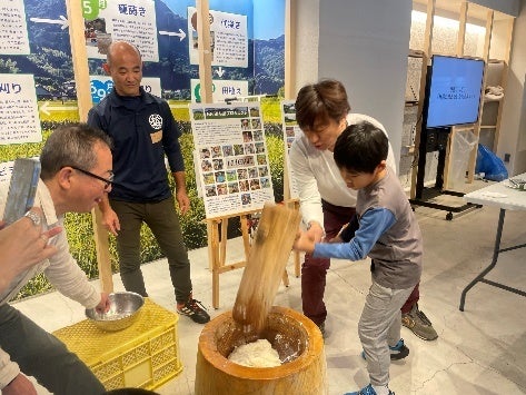 翌日26日(日)には、東京、人形町にて松崎木工塾の協力の元、松崎町で伐採した木を使ってお箸作りを体験。その後、松崎町で収穫したもち米をつかって餅つきをし、全国でも栽培者が少ない希少な緑米から作られたできたてのお餅を、作ったお箸を使っていただきました。子どもたちが、自分が普段から食べているものがどんな場所で、誰がどのような思いで、どのように作っているかを体験し、それを支える豊かな自然について考える機会となりました。