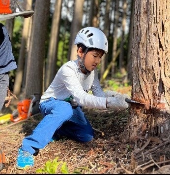 翌日22日(日)には西伊豆地域で、林業・農業の分野から環境保全と持続可能で豊かな社会の実現を目指している丸高ティーティーの協力で、木こり体験を実施しました。静岡県の件度に占める森林率は64%、西伊豆地域の森林率は87%と高い数値となっています。このような自然豊かな場で、古くから存在するものには木から作られていることが多いということや、どのように木が伐採されているかについて学びました。また実際にのこぎりを使い自らの手で木の伐採も経験しました。