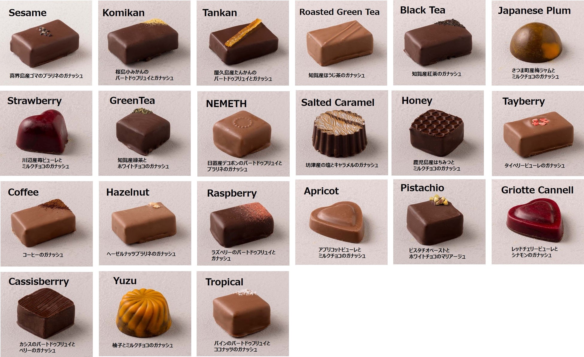 ショコラには、知覧産の紅茶やほうじ茶、さつま町産の梅など鹿児島の豊富な素材を使用。素材の風味を最大限引き出し、なめらかな食感に仕上げるためこだわりの製法で仕上げました。濃厚で上品な甘さ、食べた瞬間口の中でとろける、そして多彩な味わいで変化が楽しめる21粒のショコラとなっています。パッケージはホテル誕生60年、いわば「還暦」を迎えることができたことに、お客様への感謝と敬意を表したいというホテルの想いから、艶やかな真紅の還暦Anniversaryカラーで彩り、城山の森をイメージした繊細で優雅なオリジナルのイラストレーションを施しています。