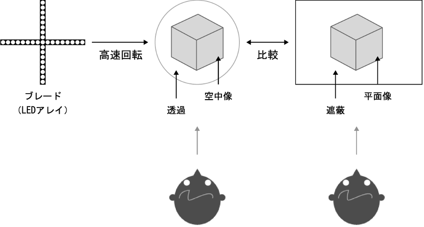 近年、屋内外の公共空間などで空中像を提示するディスプレイの社会実装が、サイネージの分野を中心に進んでいます。これらのディスプレイの多くは、LEDの配置された十字のバー(ブレード)が高速回転することで画像を提示しており、ブレード型と分類され、3Dファントムもその1種となります。
