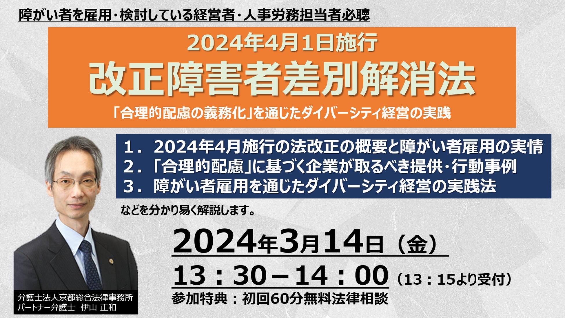 企業法務分野に精通した弁護士法人京都総合法律事務所(所在地:京都府中京区)は、2024年4月に施行される「改正障害者総合支援法」を題材にしたオンラインセミナーを、企業経営者、人事労務担当者さまを対象に2024年3月14日(金)に開催いたします。