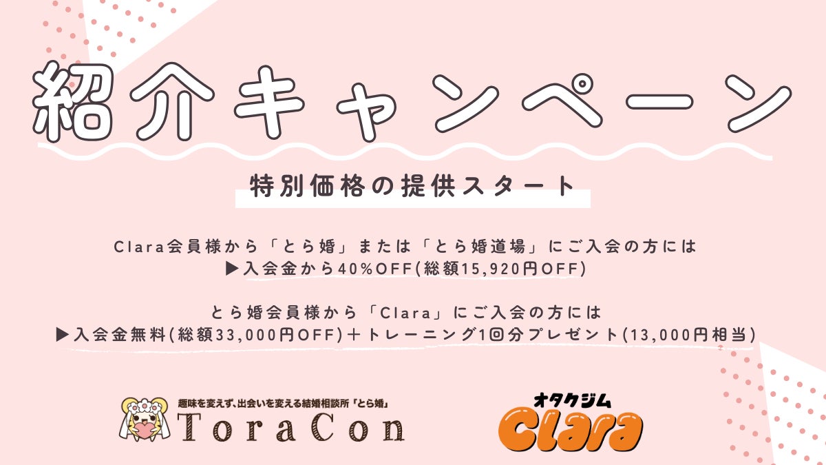 株式会社クララボが運営するオタクジム「Clara」(本社:東京都豊島区、代表:作田耀子)は、とら婚株式会社(本社:東京都千代田区、代表取締役:吉田博高)が運営するオタク向け結婚相談サービス「とら婚」及び「とら婚道場」と業務連携を開始いたしました。