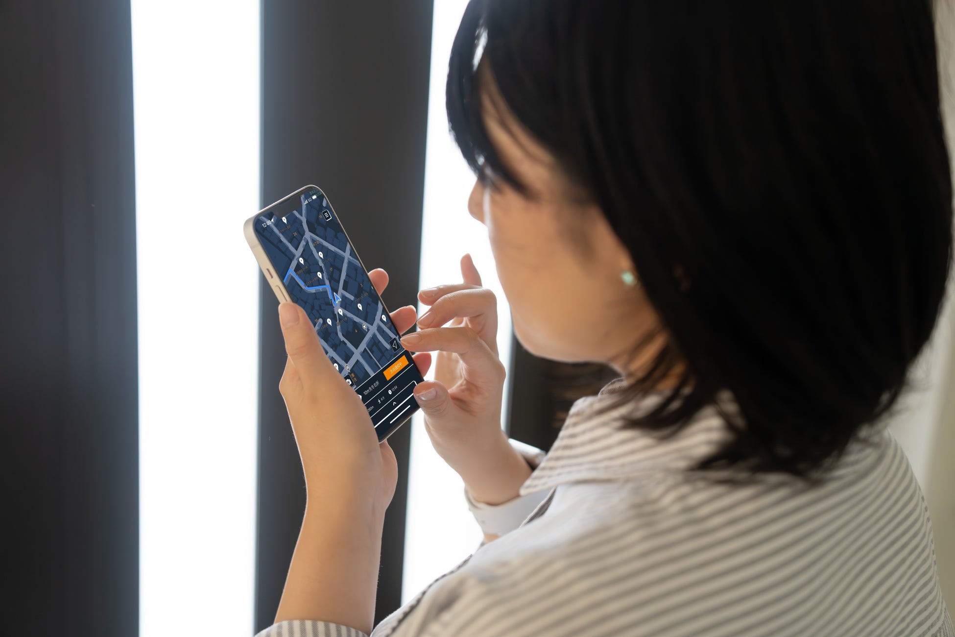 デバイスを装着した靴を履いて外出すると、足元からの振動によって目的地までのルートや曲がる方向、タイミングなどをお伝えします。また目的地設定後はスマートフォンをポケットに入れたまま利用が可能。道案内をあしらせに任せることで、視覚や聴覚を邪魔せず安全確認に集中することをサポートします。