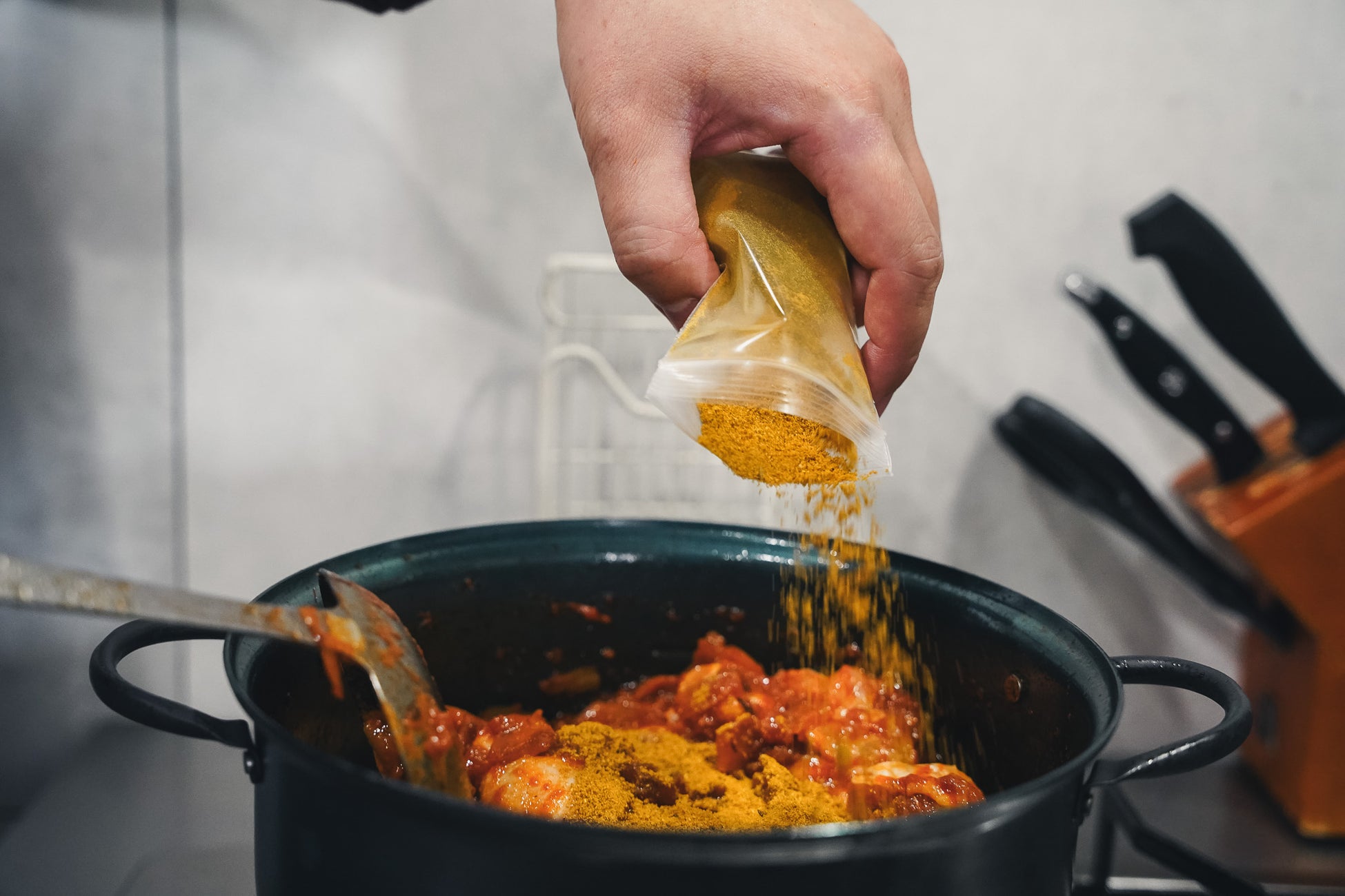 カレーをつくるスパイスキットと、できたカレーに後からかけるスパイスミックス5種類がセットになっています。例えば、辛いカレーが好きな人は辛味の強いスパイスをかけたり、苦手な人は、甘みのでるフレーバーをかけたりと、ひとつのカレーを好みの異なるメンバーと楽しむことができます。今回は、「チキンカリー」と「牛豚キーマカリー」の2種類を作りました。
