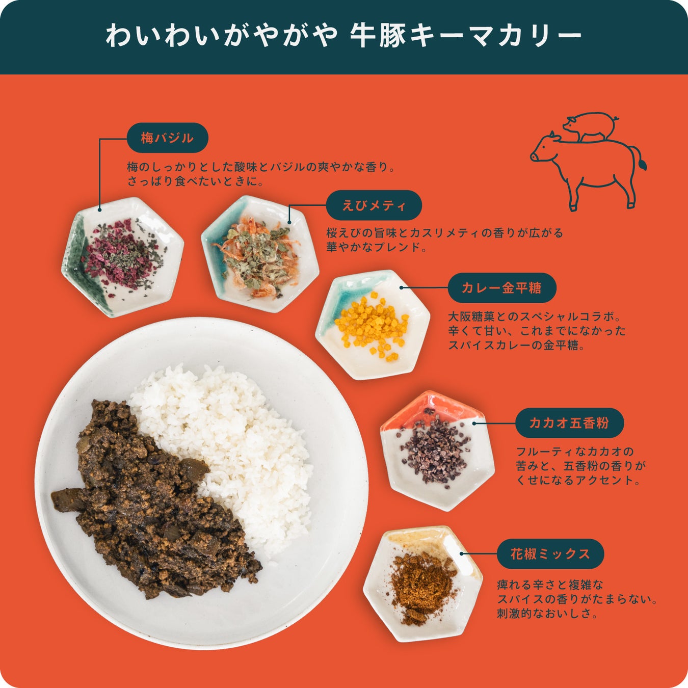 カレーの好みは、人それぞれ異なり、気分によっても変わります。そこで、家族や仲間と同じカレーをシェアするときに、ひと口ずつ味変しながら、いろんな味をたのしめるカレーを作ろうと、この「わいわいがやがやカリー」を考案しました。