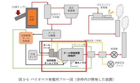 本装置は、バイオマス発電の過程で発生するタールを燃料とした排ガスを無害化するものです(図1-1参照)。