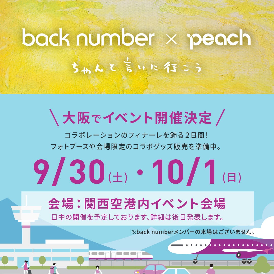 Peach Aviation 株式会社(以下: Peach、代表取締役CEO: 大橋 一成)は、9月20日19:00より3ピースバンド「back number」とのコラボグッズの販売を開始します。さらに両者のコラボレーションのフィナーレを飾るスペシャルイベントとして、関西空港内エアロプラザ2階・水の広場にて「back number×Peachポップアップショップ」を9月30日、10月1日の2日間限定でオープンします。