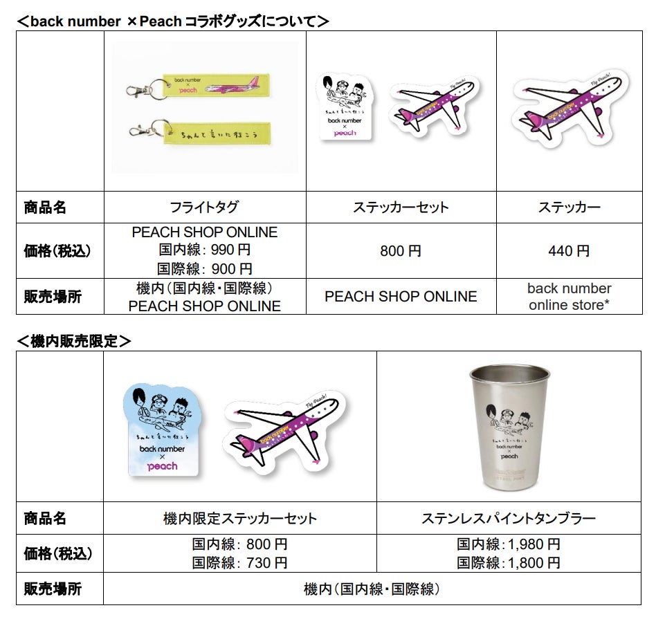 また、2日間限定でオープンする「back number×Peachポップアップショップ」では、PEACH SHOP ONLINEや機内では手に入らない限定コラボグッズが登場します。限定コラボグッズの詳細は9月20日18:00にPeach公式Instagramで行うライブ配信にて発表する予定です。