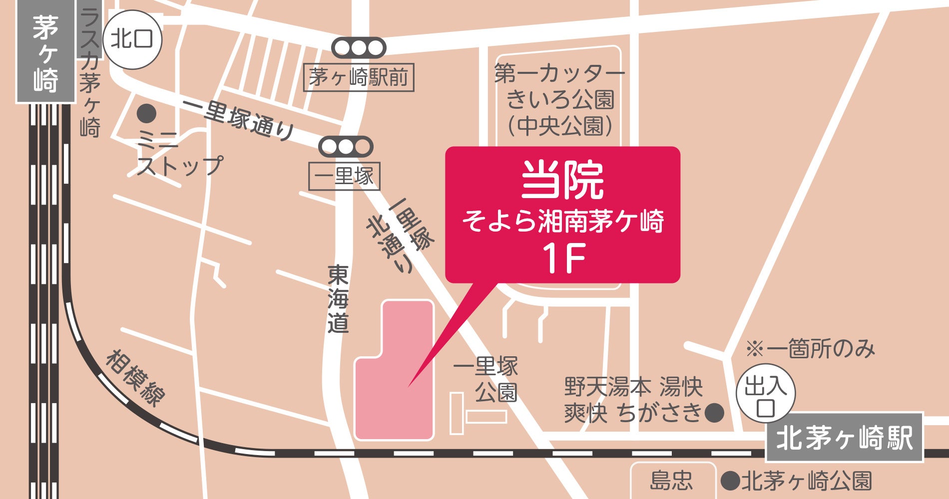 JR東海道本線・JR相模線 茅ケ崎駅、JR相模線 北茅ケ崎駅 徒歩約7分の「そよら湘南茅ケ崎」1階で、朝9時から夜21時まで、土日祝日も毎日診療を行います。