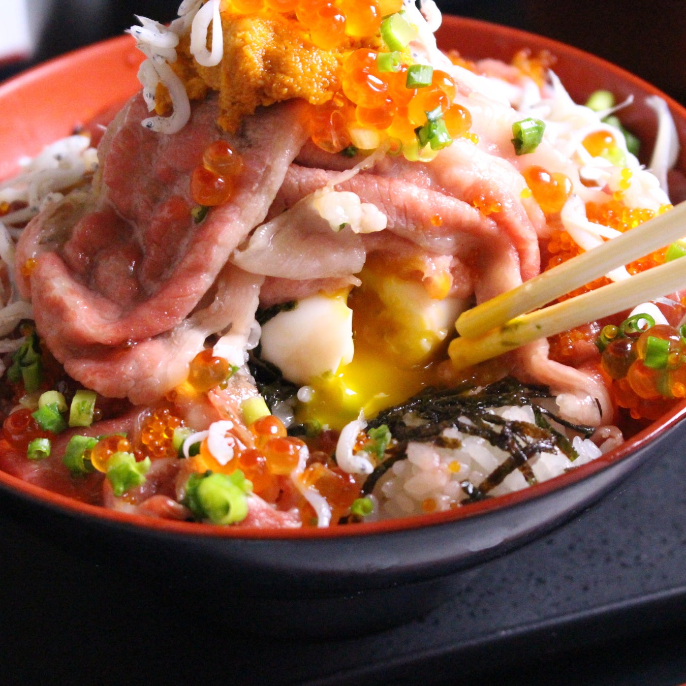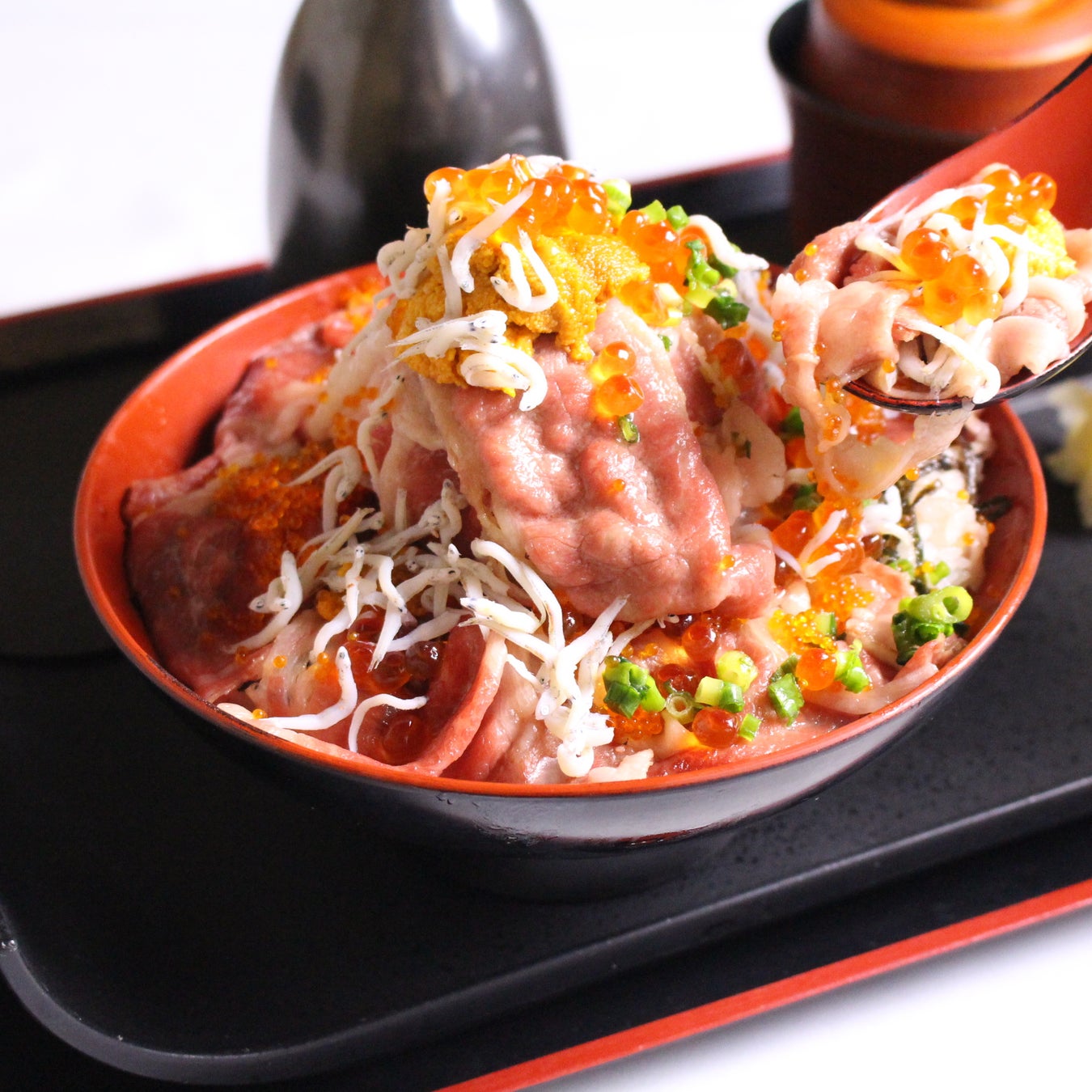 使用食材:宮崎牛、海幸彦しらす(商標登録出願中)、ねぎとろ、いくら、ウニ、とびこ、海苔、半熟卵