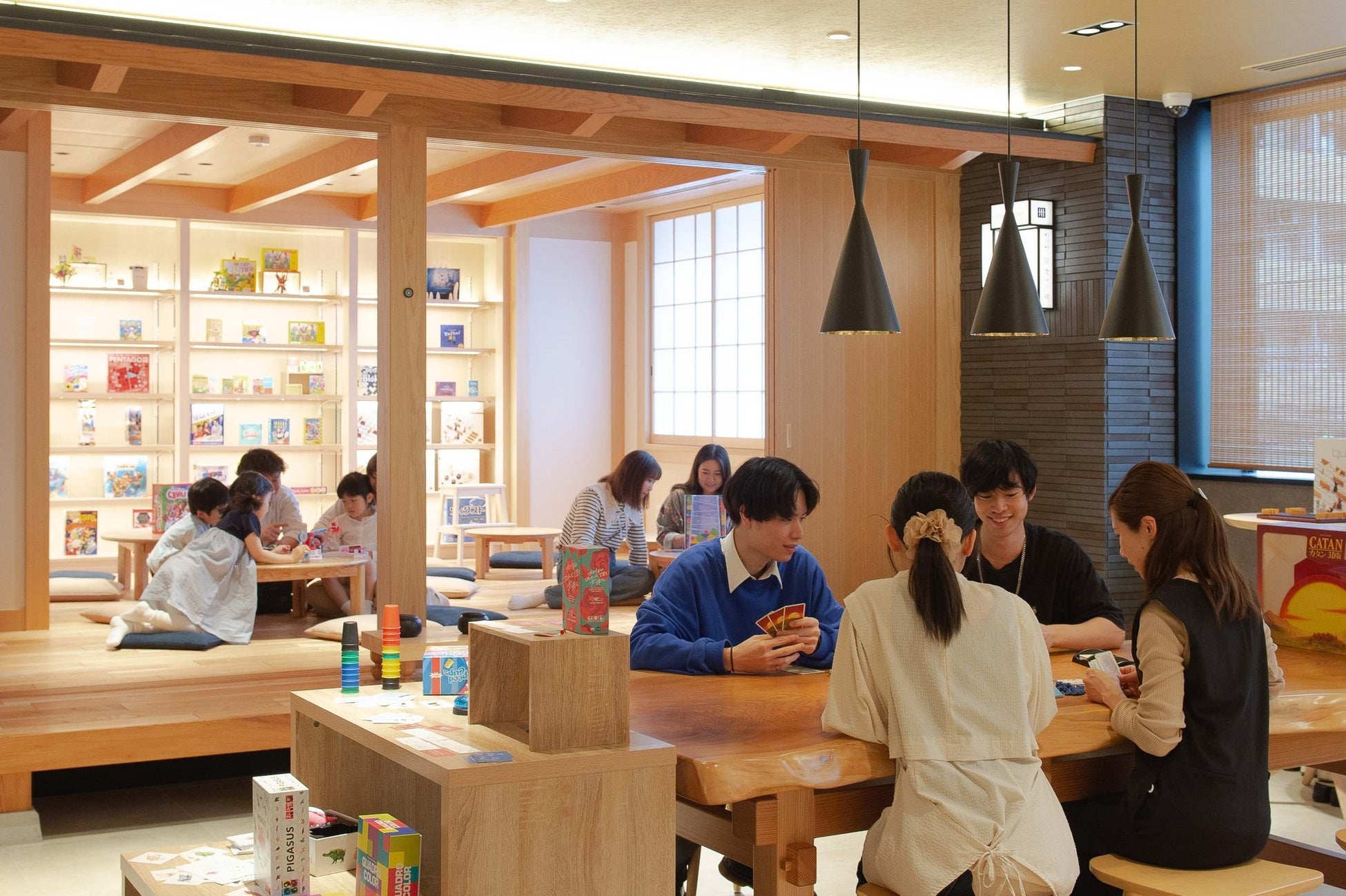 2階ロビーにある「遊べる縁側」は、130種類以上となる世界中のボードゲームを常備した遊び放題の共用スペースで客室へ貸出も行っています。ゲームは日本作家のものや海外の大賞受賞作など幅広く揃い、難易度や所要時間もさまざま。ゲーム初心者からボードゲームギークまで、あるいは子どもから大人までどのようなグループ編成でも楽しめるバラエティに富んだゲームを取り揃えています。今後「遊べる縁側」でのゲームイベントも企画予定です。