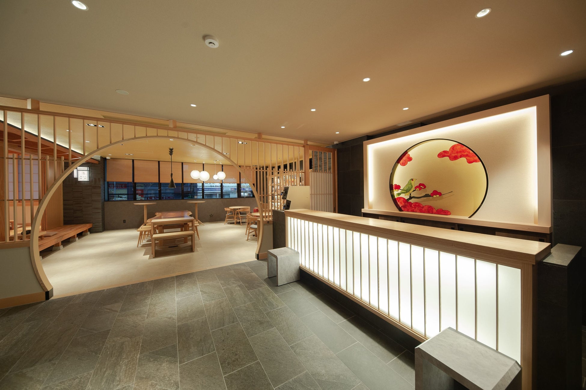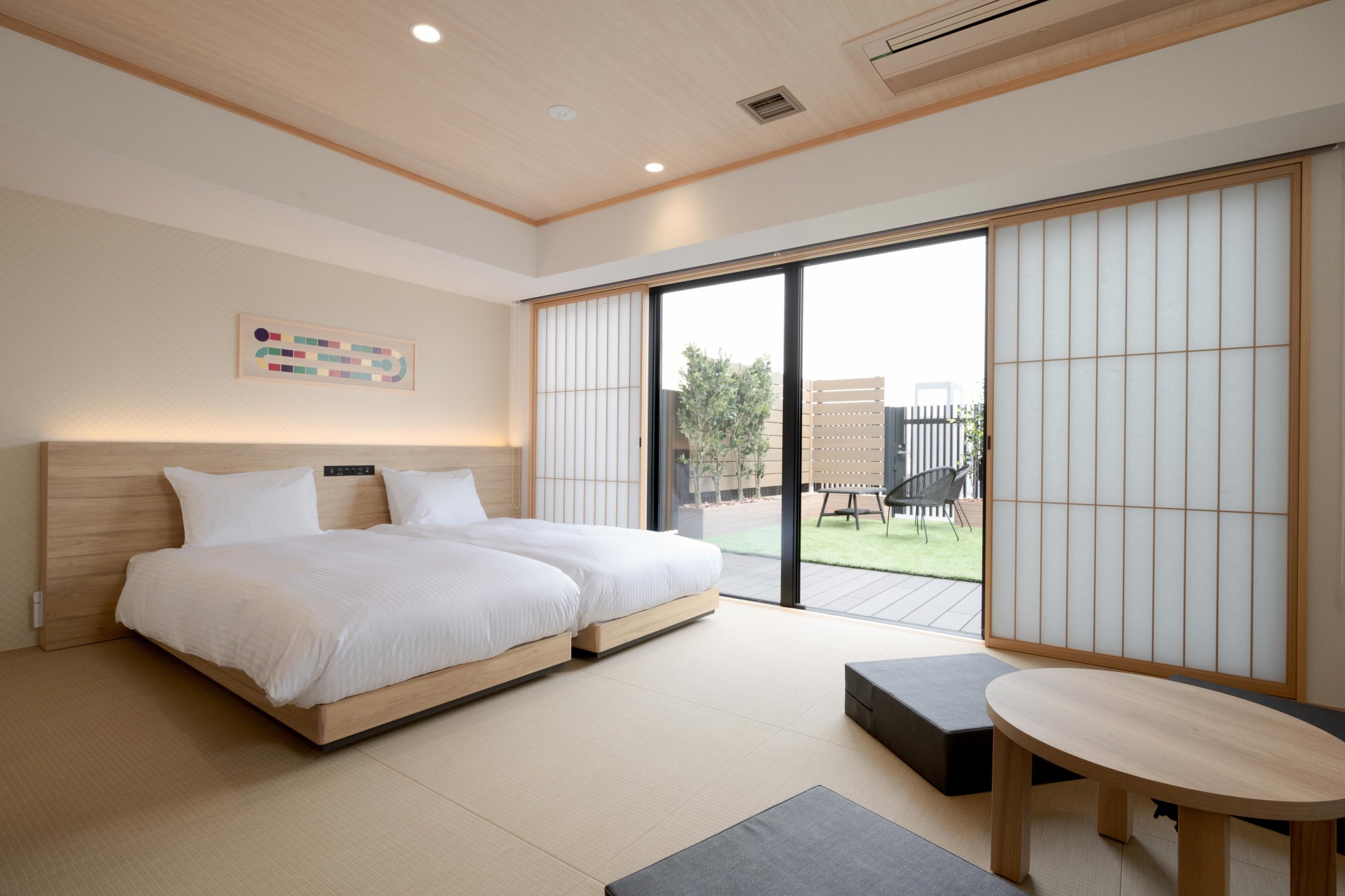 ゲストをお出迎えするフロントは、花札のアートが飾ってあり、毎月変化していく趣向を凝らしています。ロビーフロアには、ボードゲームを楽しめる「遊べる縁側」やフィットネスルーム、ランドリールームを備えています。
