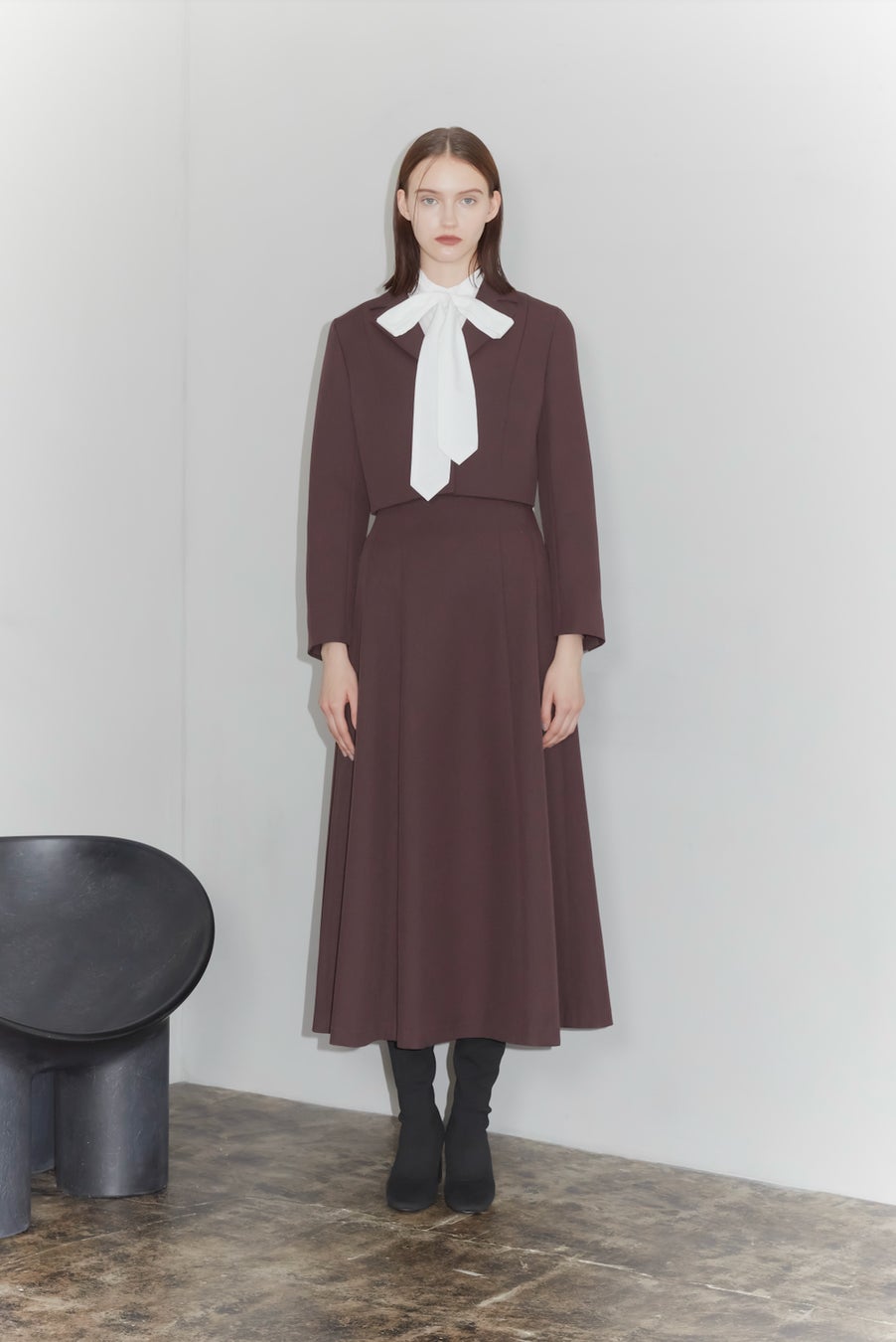 Noble short jacket(ノーブル ショート ジャケット)¥29,700-(税込) / Audire bowtie blouse(アウディーレボウタイブラウス)¥22,000-(税込) / Noble high-waist skirt(ノーブル ハイウエスト スカート)¥26,400-(税込)
