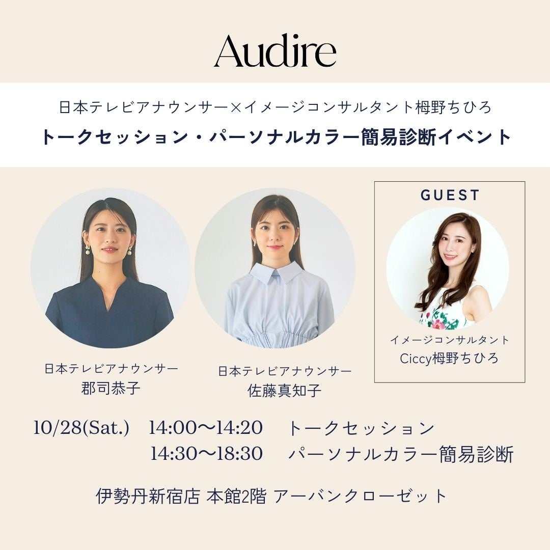 また10月28日(土)には同会場にて、日本テレビアナウンサーとゲストにイメージコンサルタント栂野ちひろさんをお呼びしトークセッションと、パーソナルカラー簡易診断を開催。