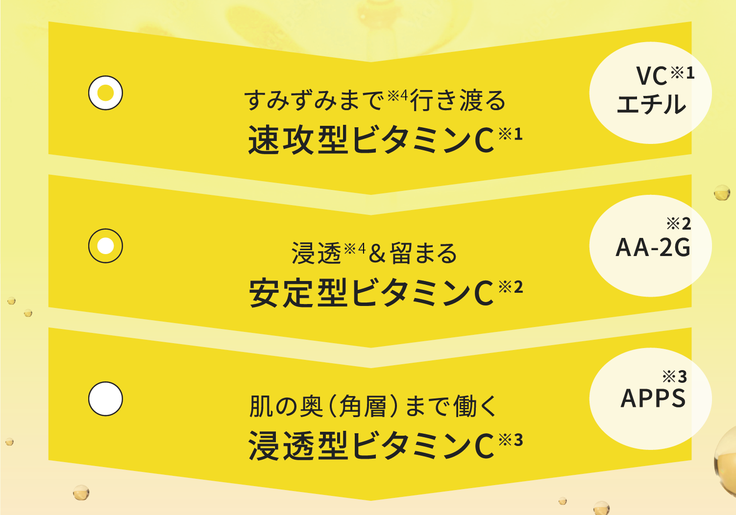 それぞれ特徴が異なる3種のビタミンC誘導体※1・2・3を贅沢に配合。