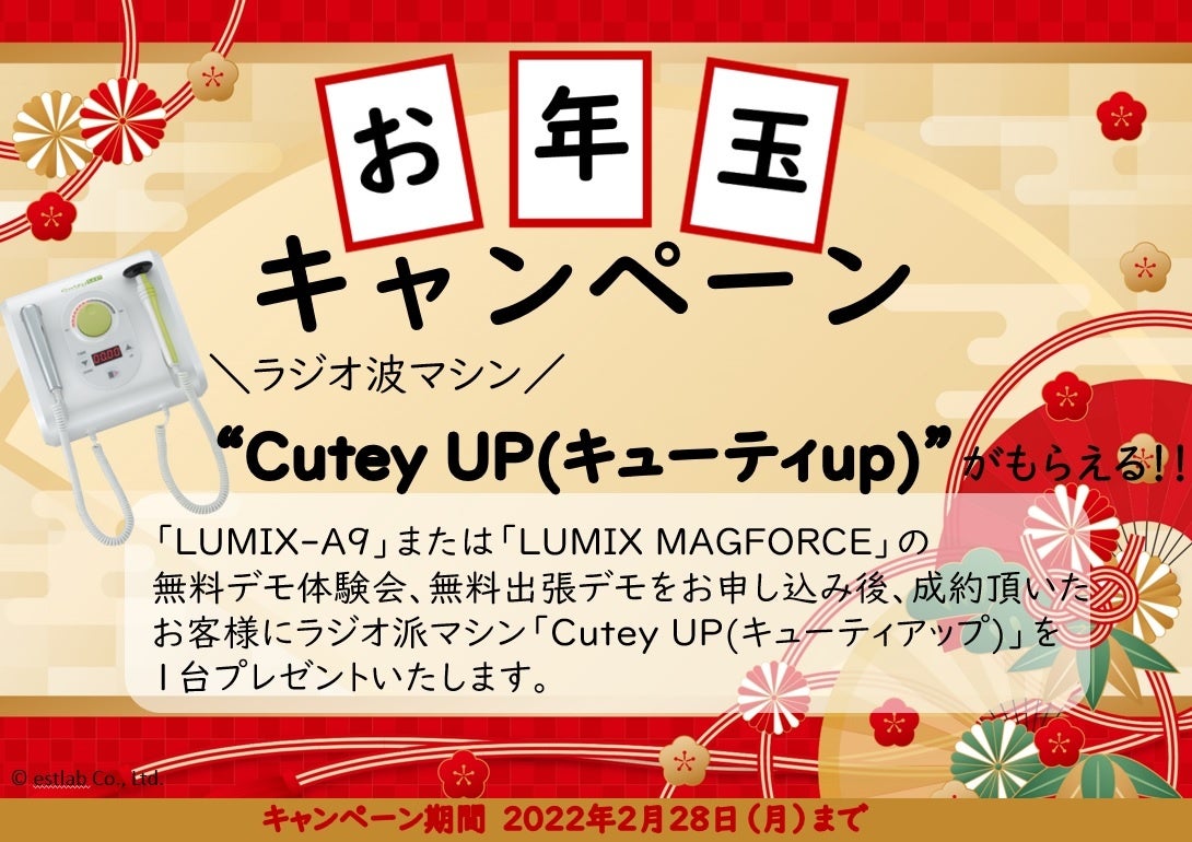 すべての人に「美」と「健康」の提供を目指す総合美容メーカーの株式会社エストラボ(本社:東京都新宿区、代表取締役社長:久保瞳)は、2022年2月28日(月)までに、業務用脱毛機「LUMIX-A9(ルミクス・エーナイン)」または、最新ダイエットマシン「LUMIX MAGFORCE(ルミクス マグフォース)」の無料デモ体験会、無料出張デモをお申し込み後、成約頂いたお客様にラジオ派マシン「Cutey UP(キューティアップ)」を1台プレゼントする、お年玉キャンペーンを実施いたします。
