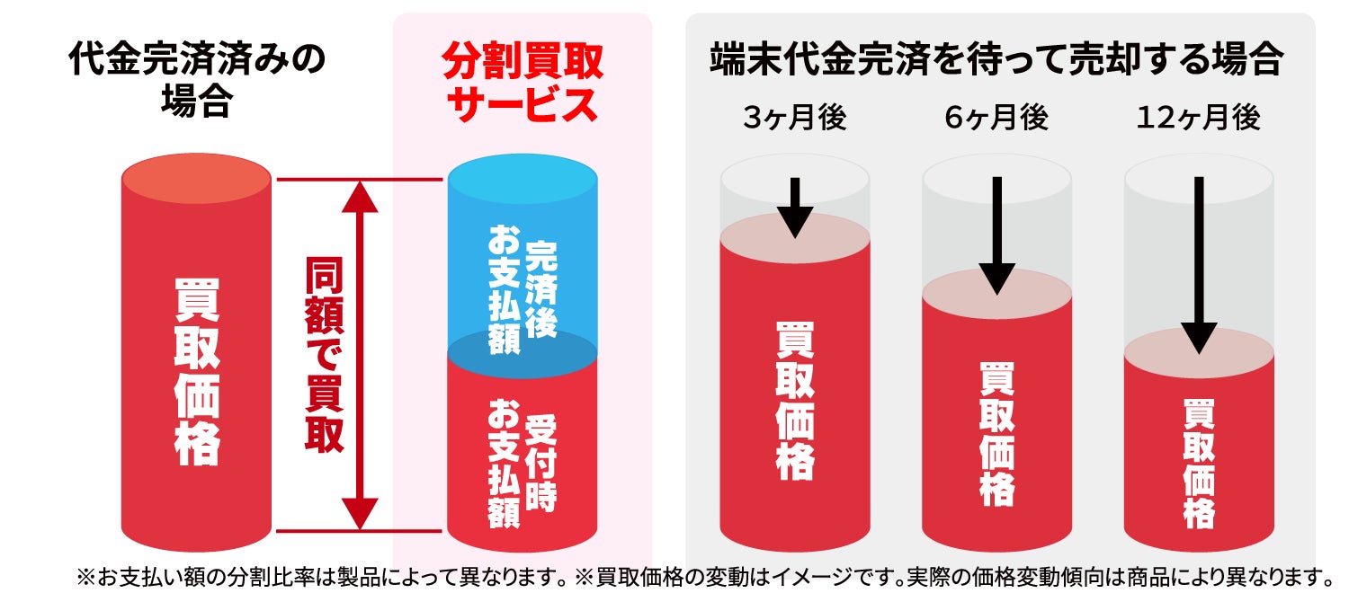 本サービスでは割賦金完済前の端末でも完済済みの端末と同一の買取価格とする代わりに、買取代金のお支払いを受付時と通信事業者への割賦金完済後の2回に分けて実施いたします。