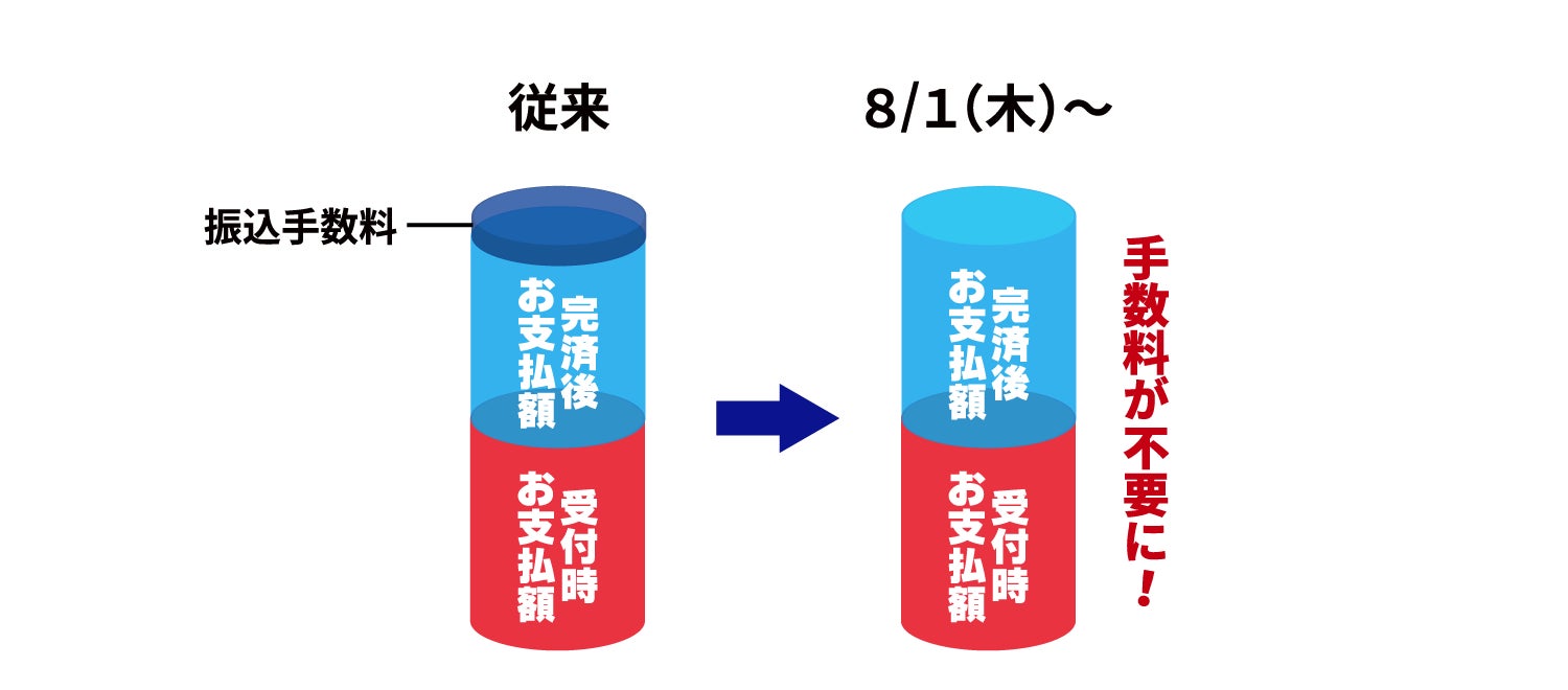 従来は割賦金完済後の買取代金お支払い時に振込手数料のご負担をお願いしておりましたが、こちらが当社負担となり、お客様のご負担は不要となります。