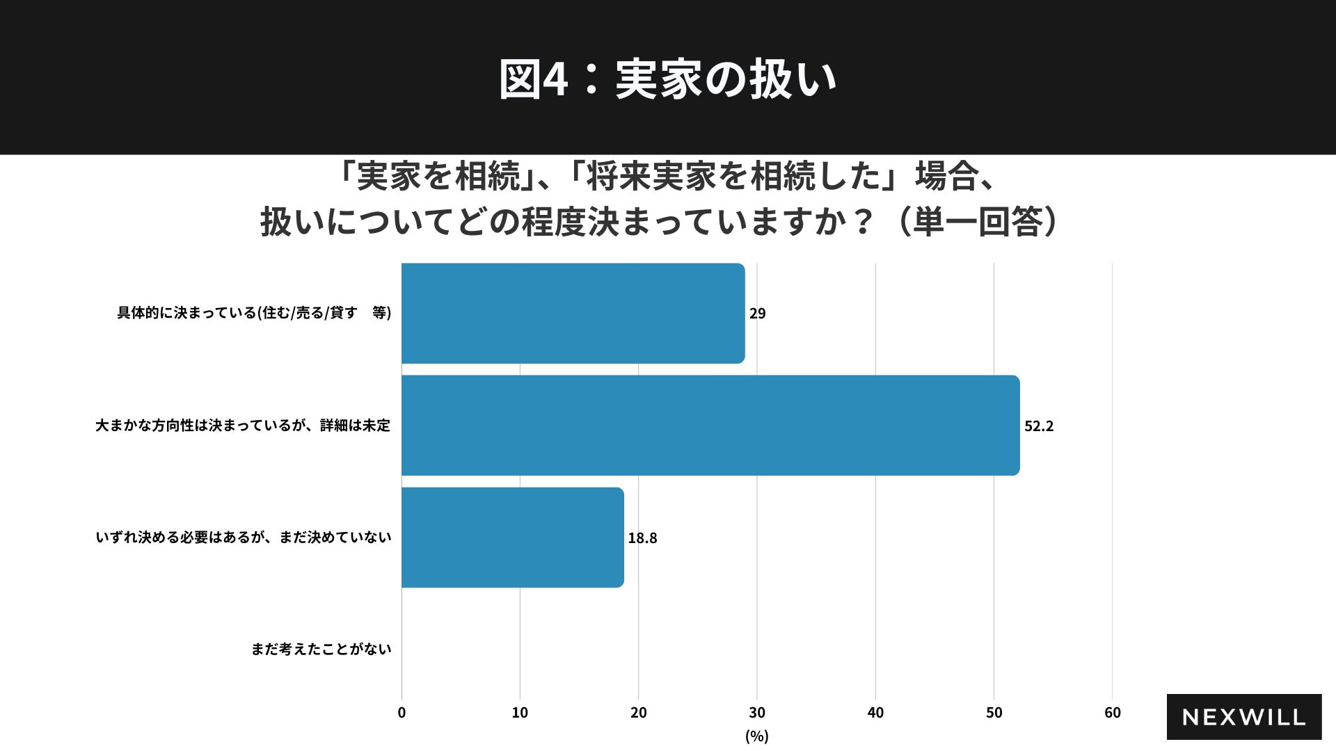 実家の相続、または相続する予定について尋ねたところ、「相続することが決まっている」(48.9%)と回答した人は約半数に上りました(図3)。相続後の実家の扱いについては、「大まかな方向性は決まっているが、詳細は未定」(52.1%)、「いずれ決める必要はあるが、まだ決めていない」(18.8%)といった回答となり、約7割が相続後の実家の扱いについて具体的な判断に至っていないことが明らかになりました(図4)。