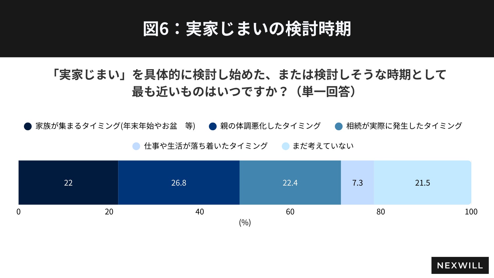 「実家を相続、または将来相続した場合、実家じまいを検討するか」を尋ねたところ、「現在進めている」(9.9%)や「将来的には検討する」(48.3%)と半数以上が“実家じまい”を検討していることが明らかになりました(図5)。”家じまい”を具体的に検討し始めた、または検討しそうなタイミングについて尋ねたところ、「親の体調が悪化したタイミング」(26.8%)や「家族が集まるタイミング(年末年始やお盆など)」(21.9%)といった、親の状況や家族との会話がきっかけになっていることが分かりました(図6)。