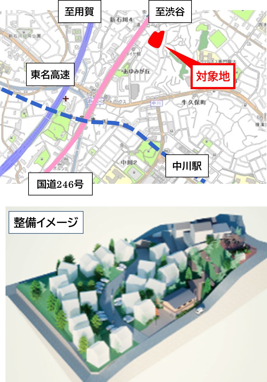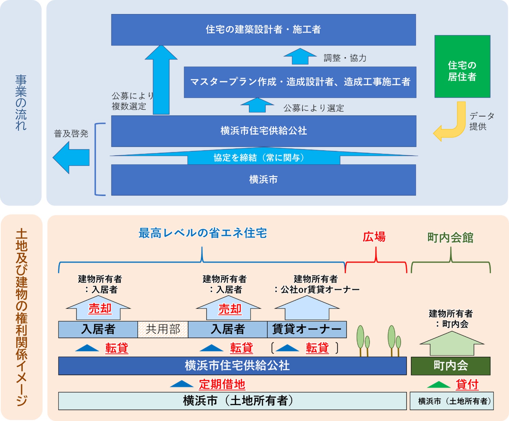 都筑区あゆみが丘9番地の公有地を活用し、横浜市が50 年以上の定期借地として貸し付けを横浜市住宅供給公社に行い、街区レベルのショーケースを創出します。