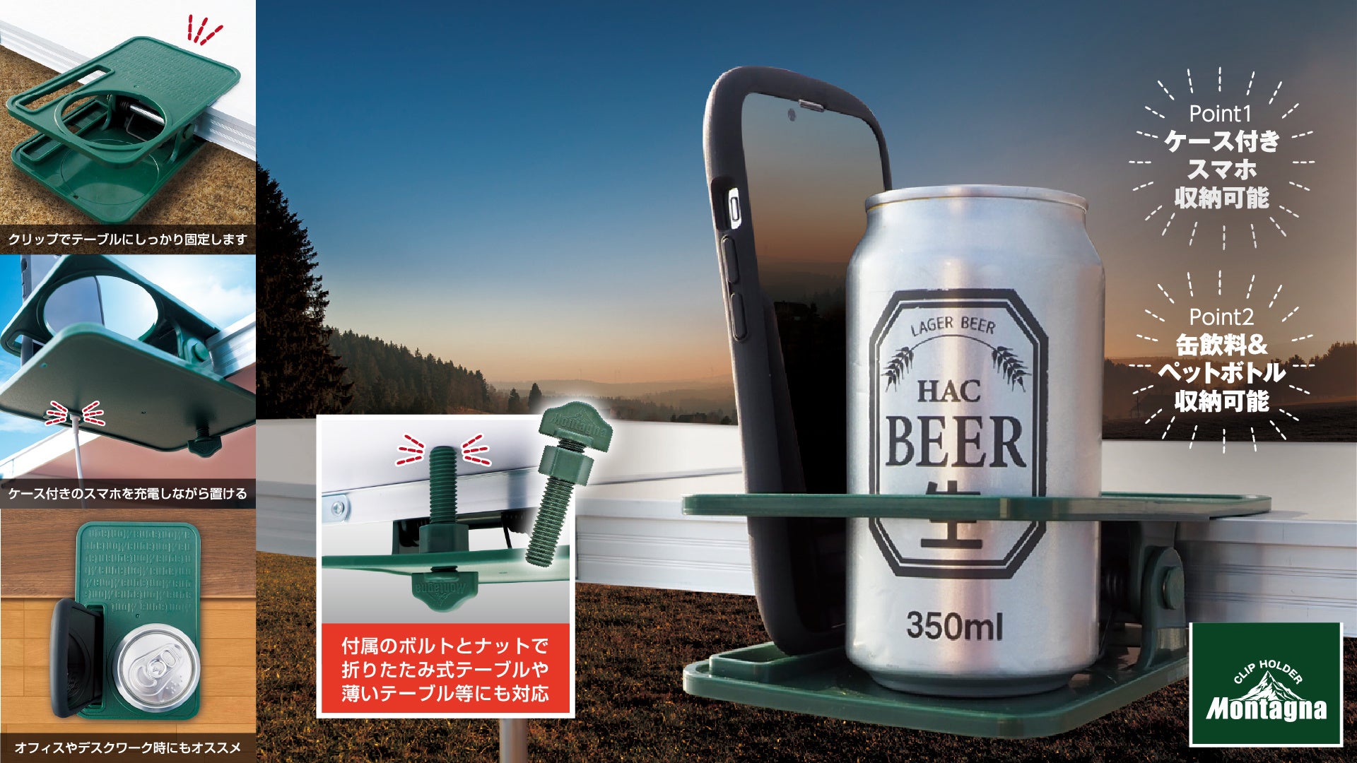 特徴:テーブルにクリップで固定するだけの簡単設置で、キャンプテーブルの利便性をさらにUP。ドリンクとスマホを同時に手元に置ける嬉しいアイテムです。ナット付きで高さの微調整が可能で、フチのあるテーブルにもしっかりと固定できます。