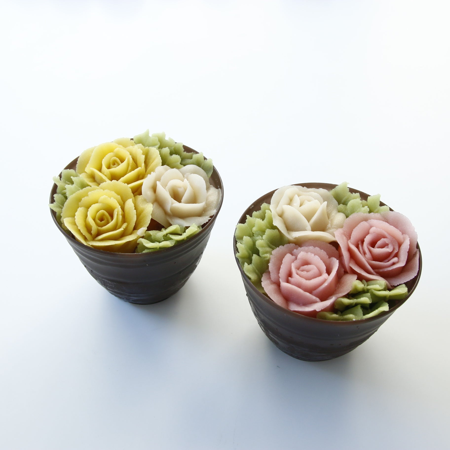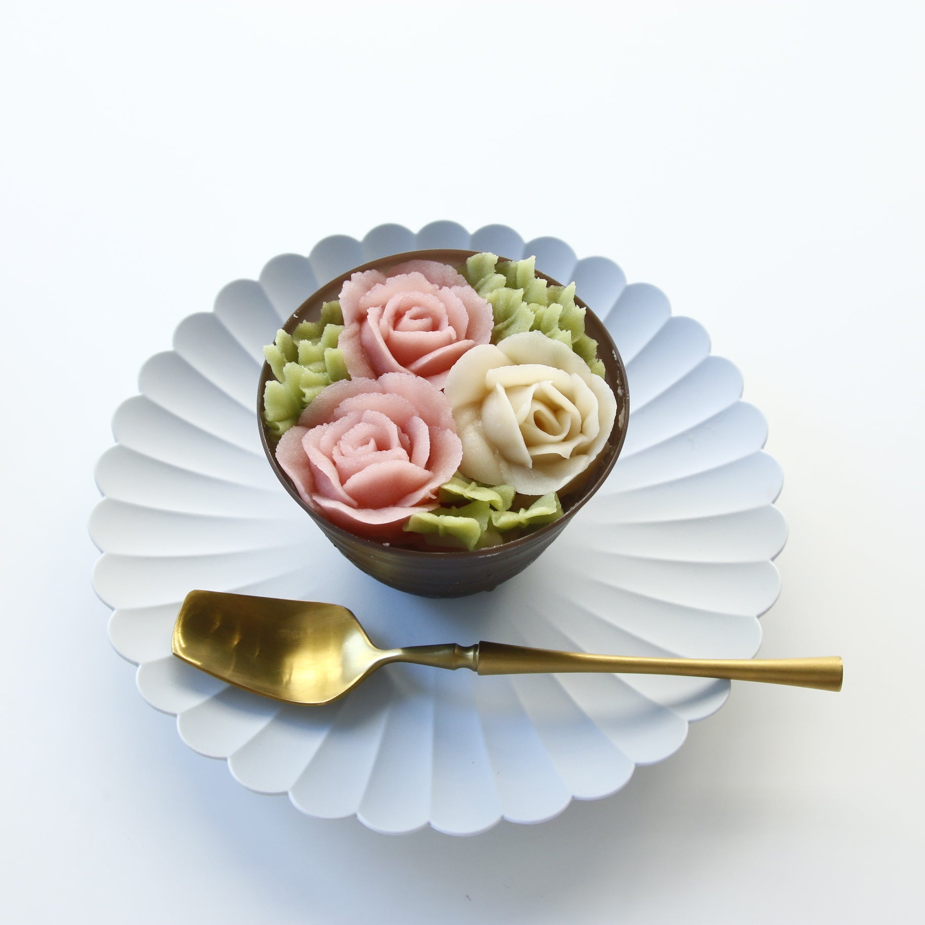 アイスクリーム(バニラ・ほうじ茶)の上に餡で絞ったバラを添えた「フラワーアイス」は、