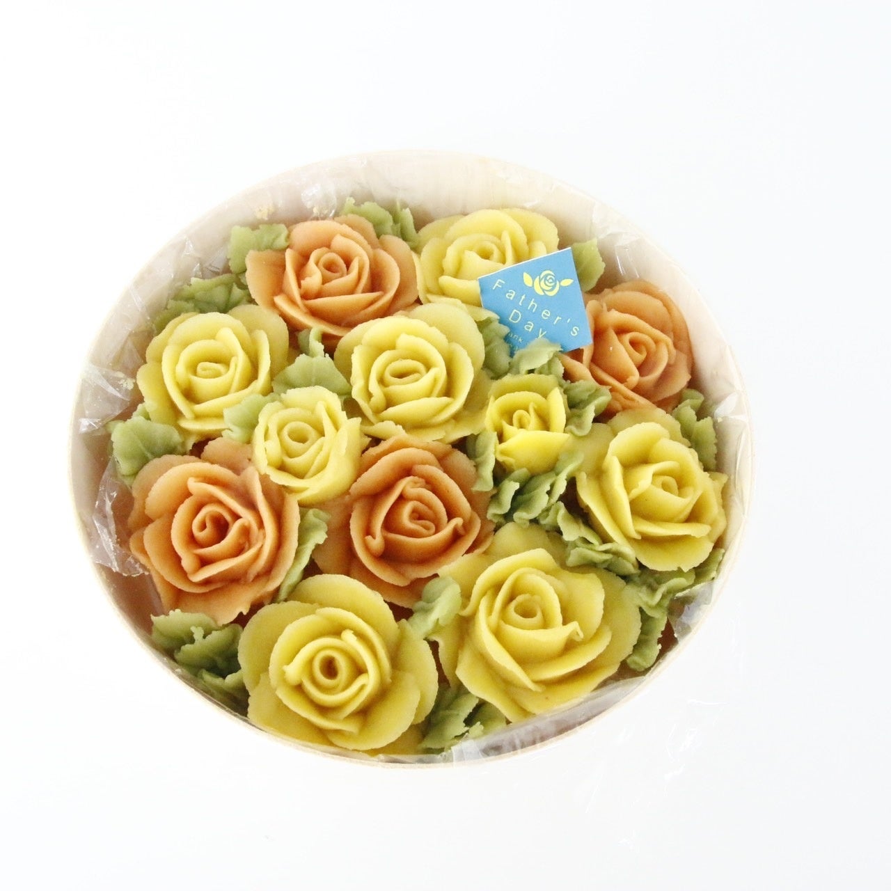 父の日の贈り物として定番の黄色いバラを、餡子で絞っておはぎの上に敷き詰めました。
