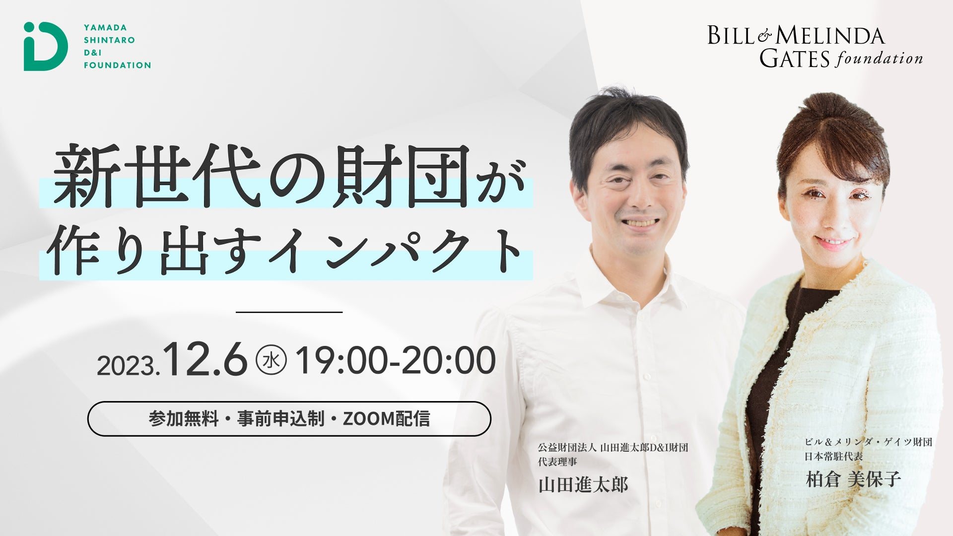 この募集にあたって、「すべての人が健康的で生産的な生活を送れるように支援を行う」という中核的な使命を掲げ、新型コロナウイルス感染症を含めて世界各国で大きなインパクトをもたらした米国のビル&メリンダ・ゲイツ財団の日本常駐代表である柏倉 美保子氏をお招きし、当財団代表理事の山田 進太郎とのディスカッションを通じて、財団がもたらすインパクトをテーマに、これからの社会貢献活動の可能性と、社会的使命を持つ財団における仕事のやりがいについて考えていきます。