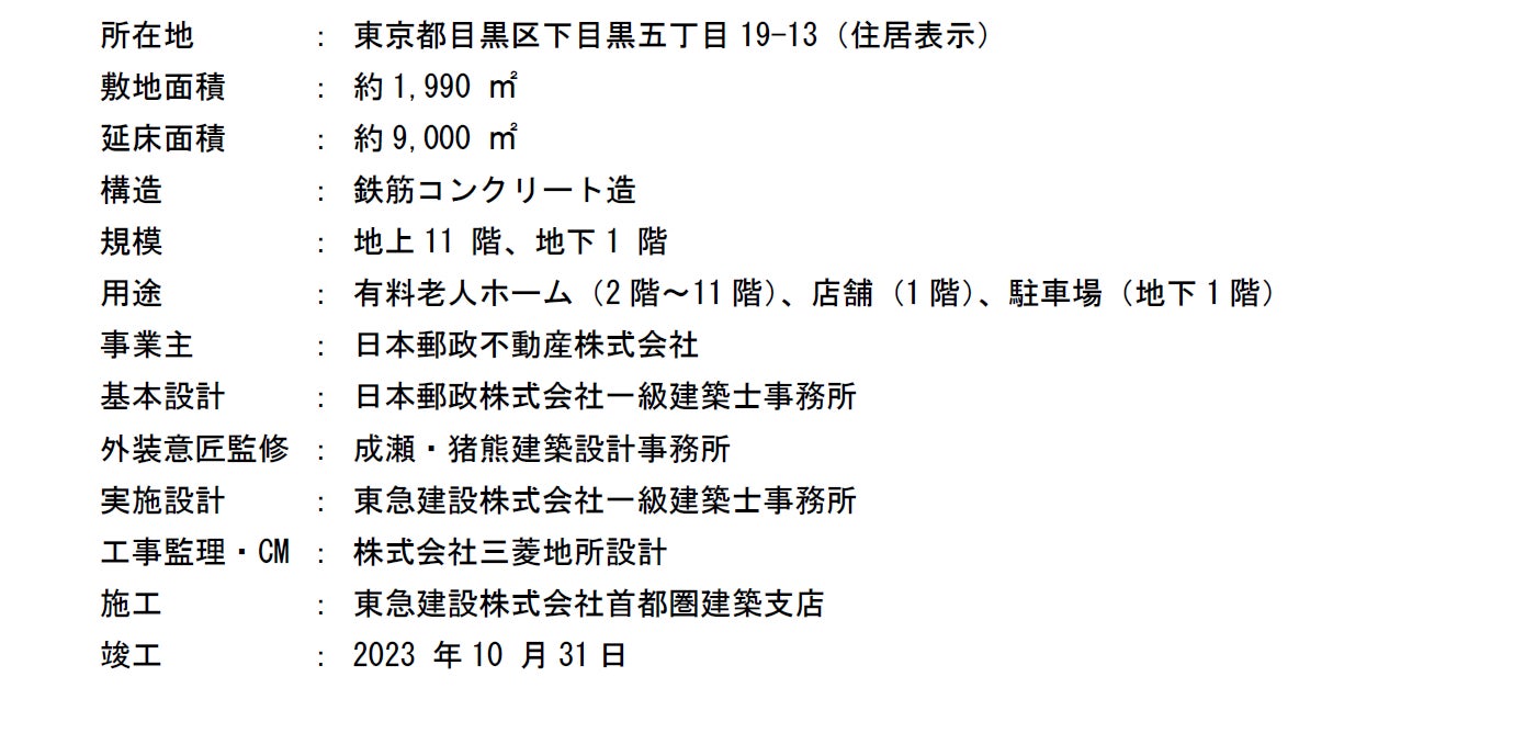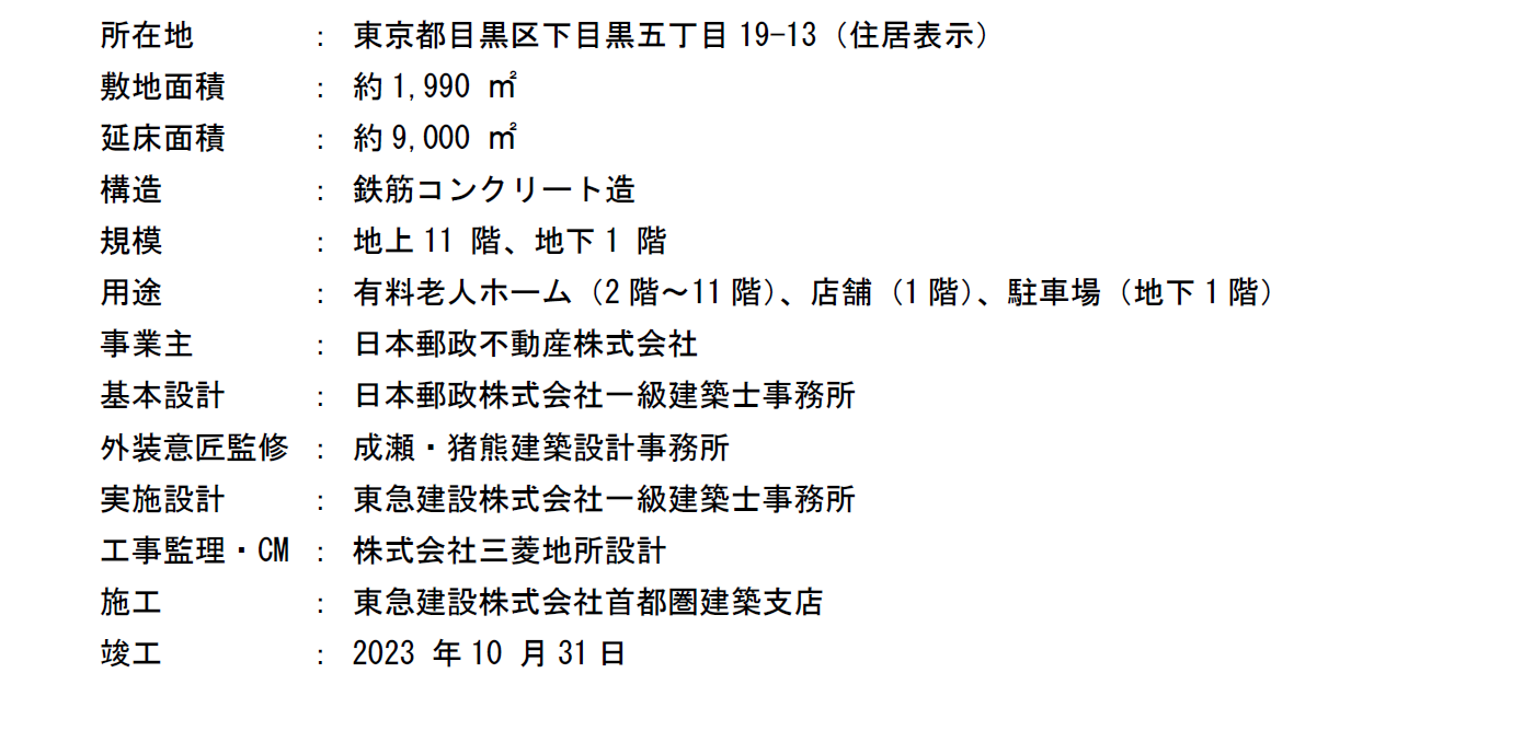 日本郵政不動産株式会社(東京都千代田区、代表取締役社長 山代裕彦)は、東京都目黒区下目黒五丁目において開発・推進してまいりました、介護付有料老人ホームと店舗の複合施設「ブランシエール目黒」が本日竣工を迎えましたので、お知らせします。