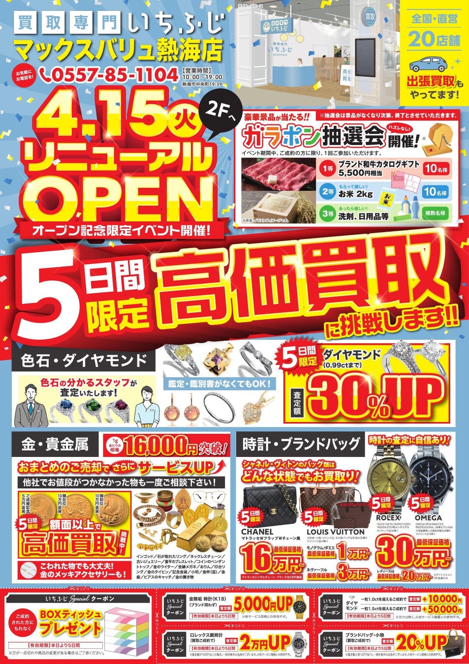 このたび、マックスバリュ熱海店にて営業してまいりました「買取専門いちふじ」は、2025年4月15日(火)に店舗を3階から2階へ移転し、リニューアルオープンいたします。