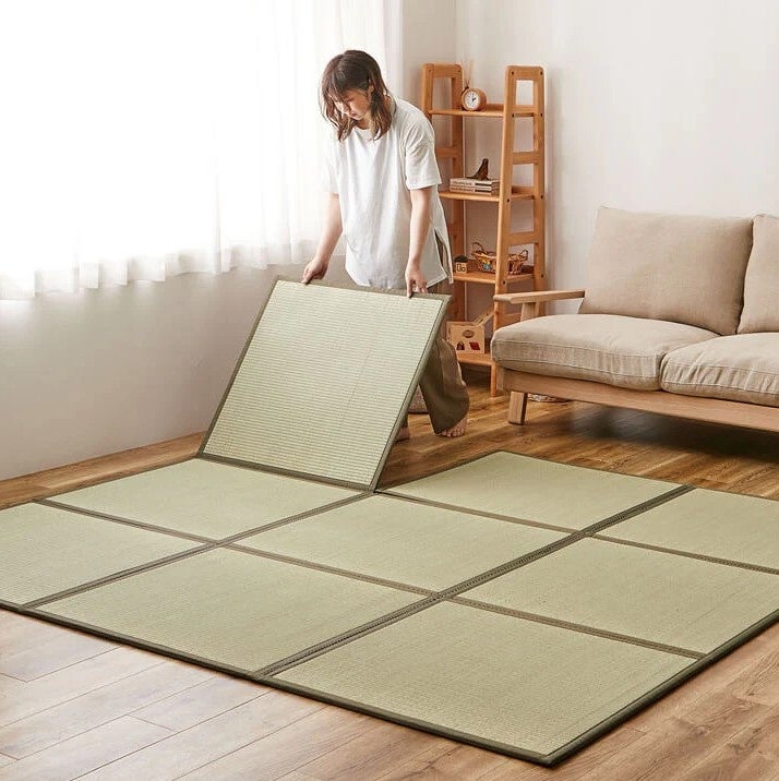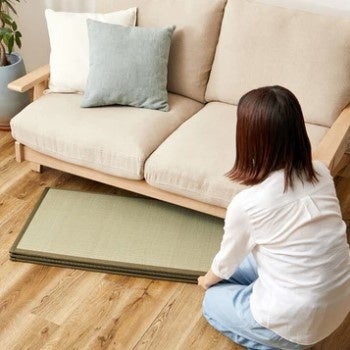 広げると約4.5畳(約225×225cm)の大きさになる9枚連結畳は、9枚の置き畳を連結したことで1枚1枚の隙間をなくし、綺麗に敷くことができる置き畳です。使わない時は折り畳んでコンパクト(約150×75cm)に収納出来ます。