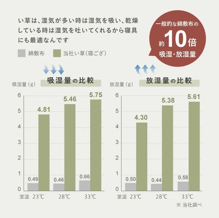 い草は、同じ面積の一般的な綿素材の敷布と比較して、吸湿量・放湿量ともに約10倍。いつでもさらりとした肌触りで快適です。加えて、い草の持つ天然の「森林浴効果」でさらに快適に過ごせます。