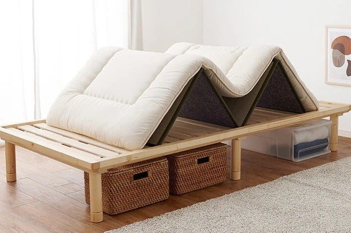 畳マットレスを折り曲げれば、手軽に布団を干しながらスノコの乾燥もでき、寝具を清潔に保てます。
