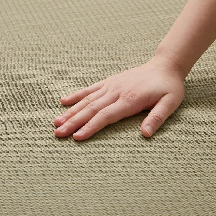経糸とい草が1本ずつ交互に浮き沈みしながら交錯した平織です。さらっと心地のよい肌触りです。生成色の縁になったことで明るくなり、ナチュラルインテリアに合わせやすくなりました。複数枚を組み合わせて広い畳スペースにも使用できます。