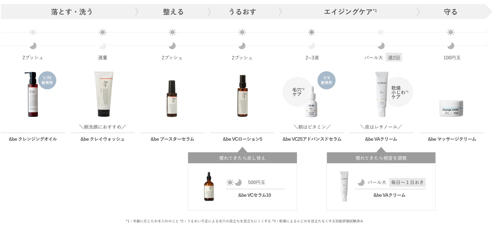 「&be」エイジングケアラインが提案するのは、朝にビタミンC、夜はビタミンA(レチノール)のダブルチャージ※1でエイジングサイン※2に本気で向き合うスキンケア。新発売の『&be VC25 アドバンスドセラム』でビタミンCを、使い続けることで肌のハリが“ぴんっ”とし、“きゅっ”と引き締まり、“ぱっ”と明るい透明肌へ導きます※3。乾燥による小じわを目立たなくする効能評価試験済みの『&be VAクリーム』は、4種のレチノール※4を配合した最高峰※5、ナイトクリーム。