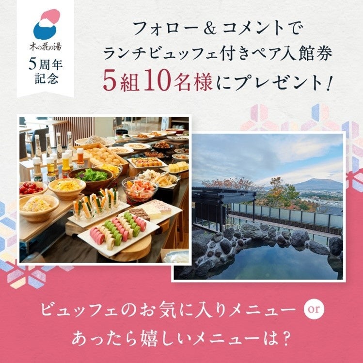 日帰り温泉施設“木の花の湯”では、開業5周年を記念した『Instagramフォロー&コメントキャンペーン』も開催。当施設の公式Instagramアカウントをフォローし、当キャンペーンの告知投稿に対して「ビュッフェのお気に入りメニュー」または「あったら嬉しいメニュー」に関するコメントを投稿いただいた方の中から抽選で5組10名様に、“木の花の湯”ランチビュッフェ付きペア入館券が当たるキャンペーンを2024年12月1日から12月22日まで実施いたします。