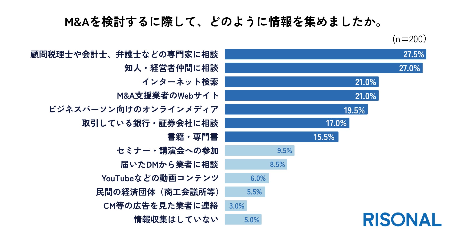M&A検討時の情報収集方法について尋ねたところ、「顧問税理士や会計士、弁護士などの専門家に相談」が27.5%で最も多く、「知人・経営者仲間に相談」が27.0%、「インターネット検索」が21.0%と続きました(n=200/M&Aでトラブル経験のある方)。