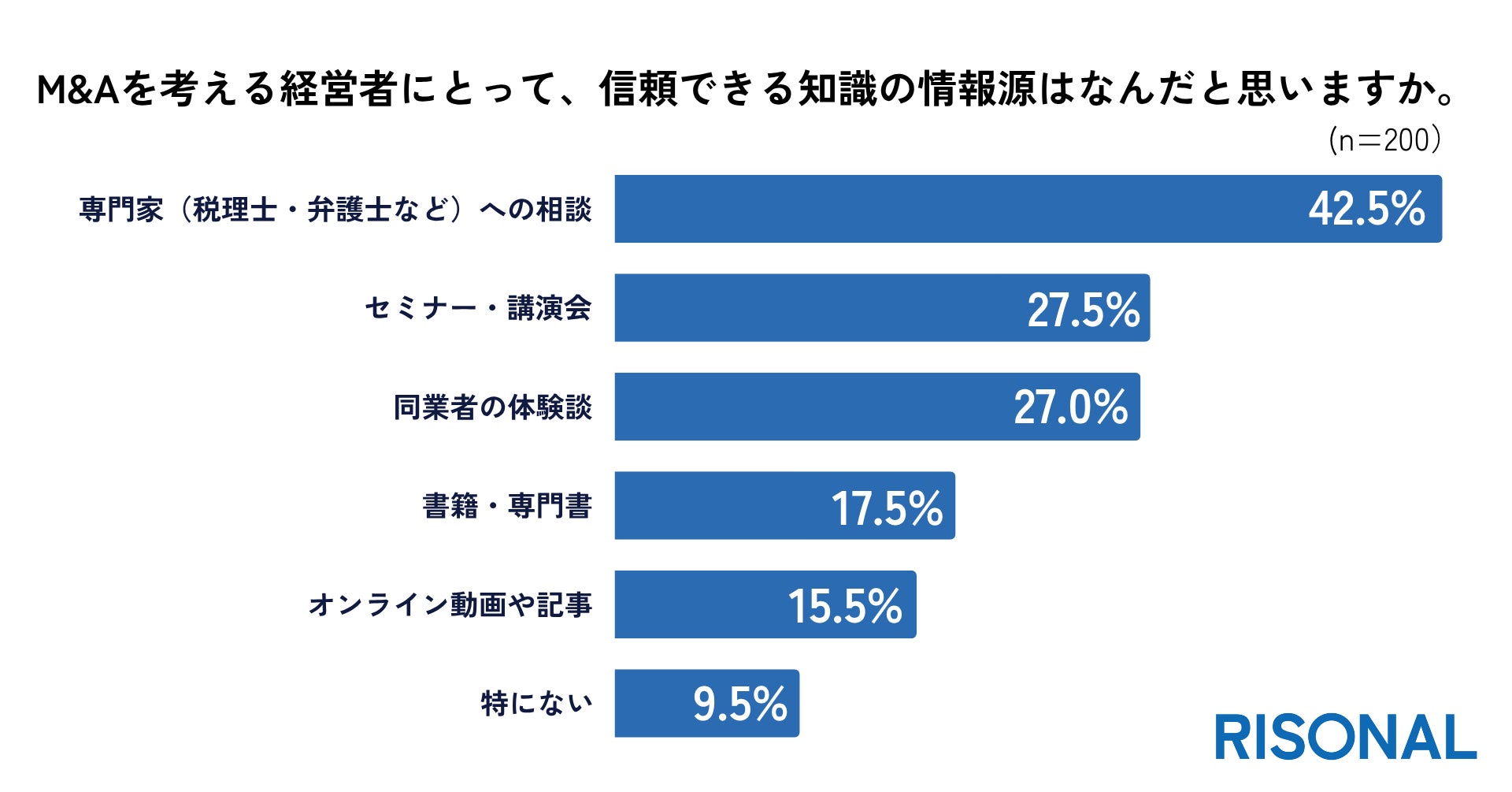 M&Aに関する知識の情報源として信頼できるものを尋ねたところ、「専門家(税理士・弁護士など)への相談」が42.5%で最も多く、「セミナー・講演会」が27.5%、「同業者の体験談」が27.0%と続きました(n=200/M&Aでトラブル経験のある方)。