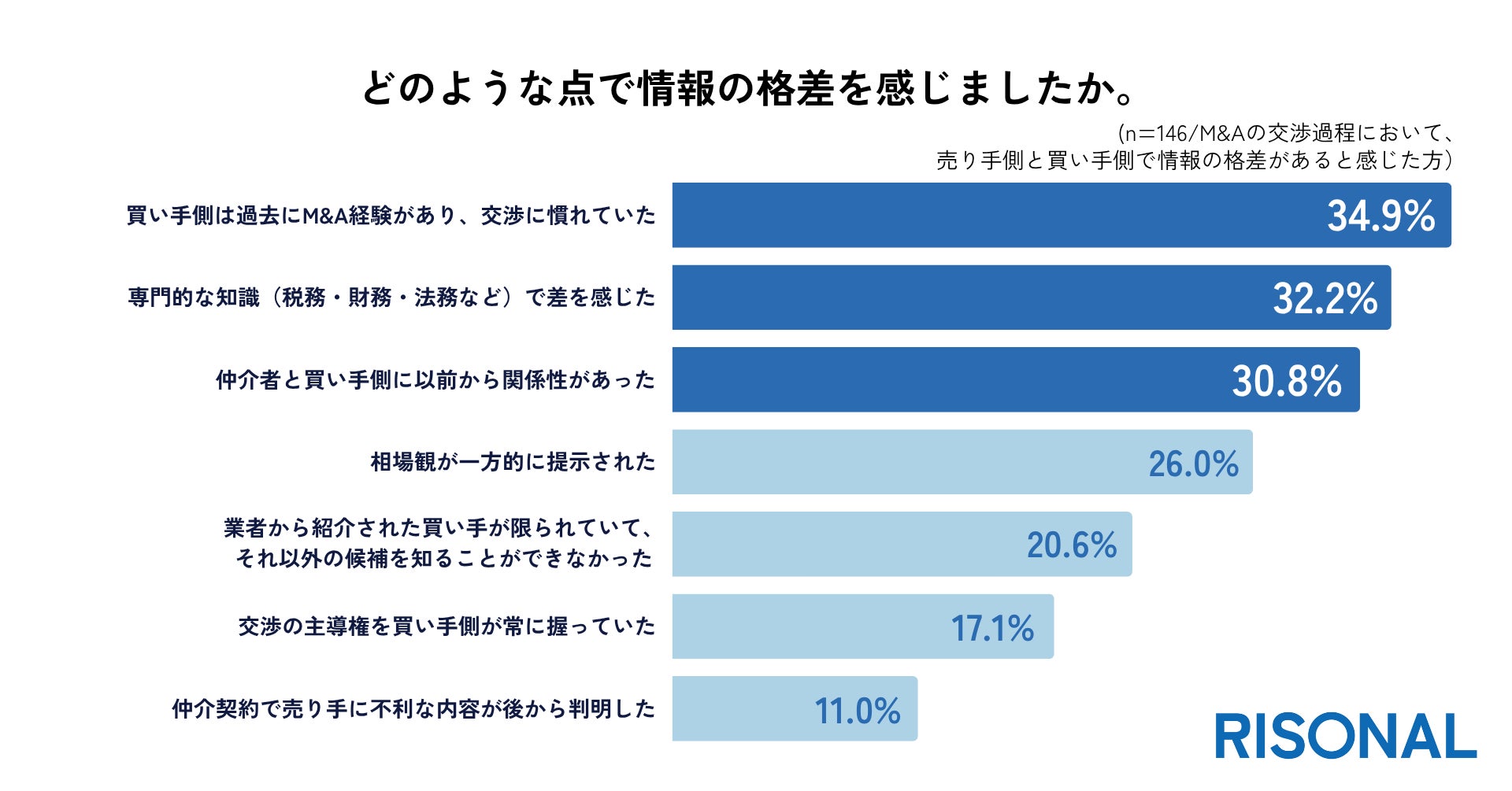情報格差を感じた点について尋ねたところ、「買い手側は過去にM&A経験があり、交渉に慣れていた」が34.9%で最も多く、「専門的な知識で差を感じた」が32.2%、「仲介者と買い手側に以前から関係性があった」が30.8%と続きました(n=146/M&Aの交渉過程において、売り手側と買い手側で情報の格差があると感じた方)。