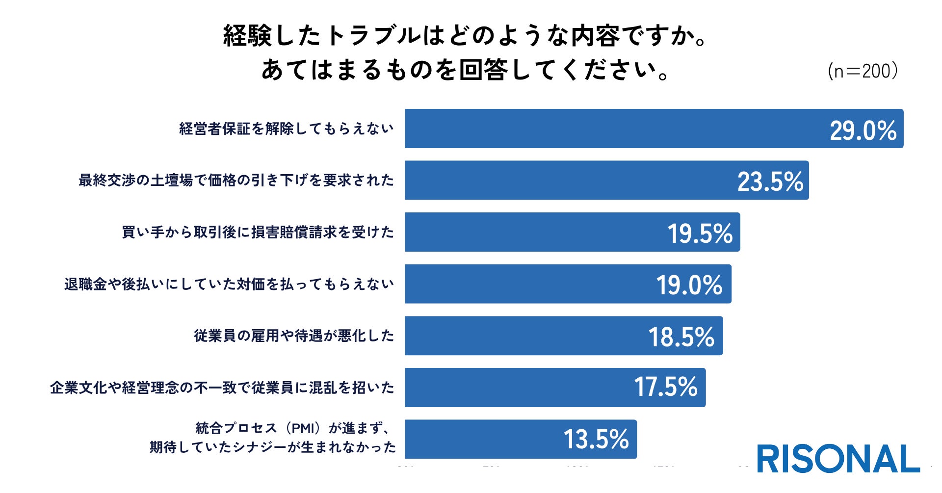 M&Aで経験したトラブルについて尋ねたところ、「経営者保証を解除してもらえない」が29.0%で最も多く、「最終交渉の土壇場で価格の引き下げを要求された」が23.5%、「取引後に損害賠償請求を受けた」が19.5%と続きました(n=200/M&Aでトラブル経験のある方)。