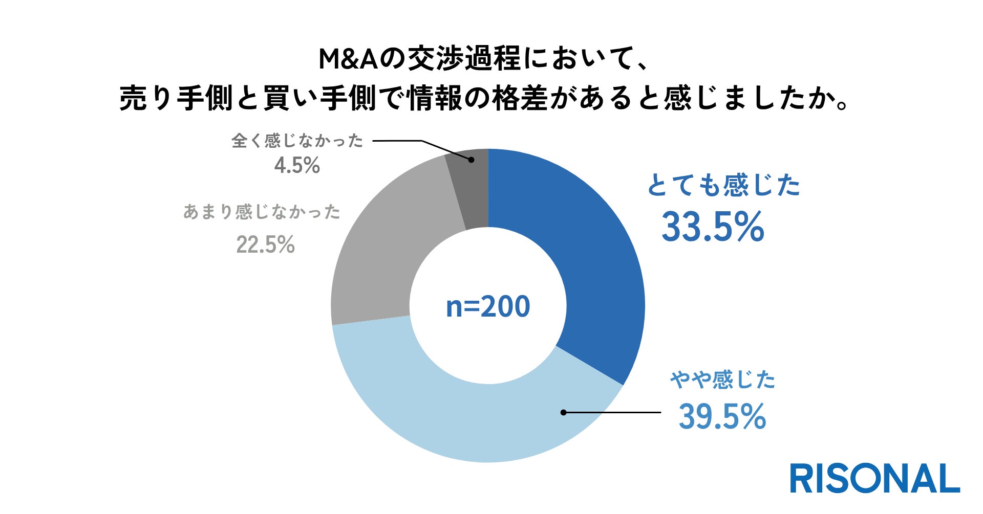 M&Aの交渉過程において売り手側と買い手側の情報の格差を感じたか尋ねたところ、73.0%が格差を実感したことがわかりました(n=200/M&Aでトラブル経験のある方)。