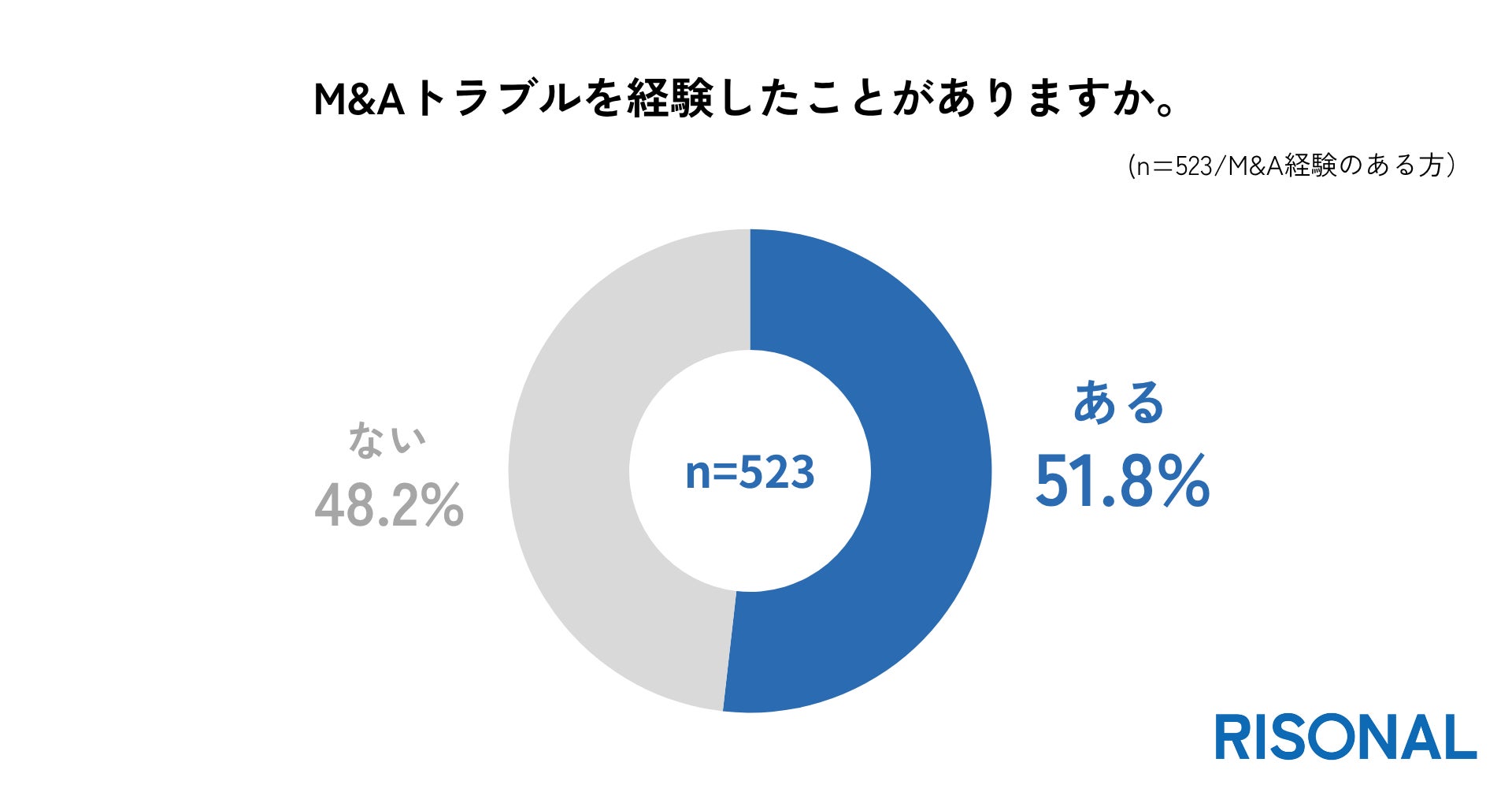 過去にM&Aを経験した方に、何かしらのトラブルに遭ったことがあるか尋ねたところ、51.8%が「ある」と回答しました(n=523/M&A経験のある方)。