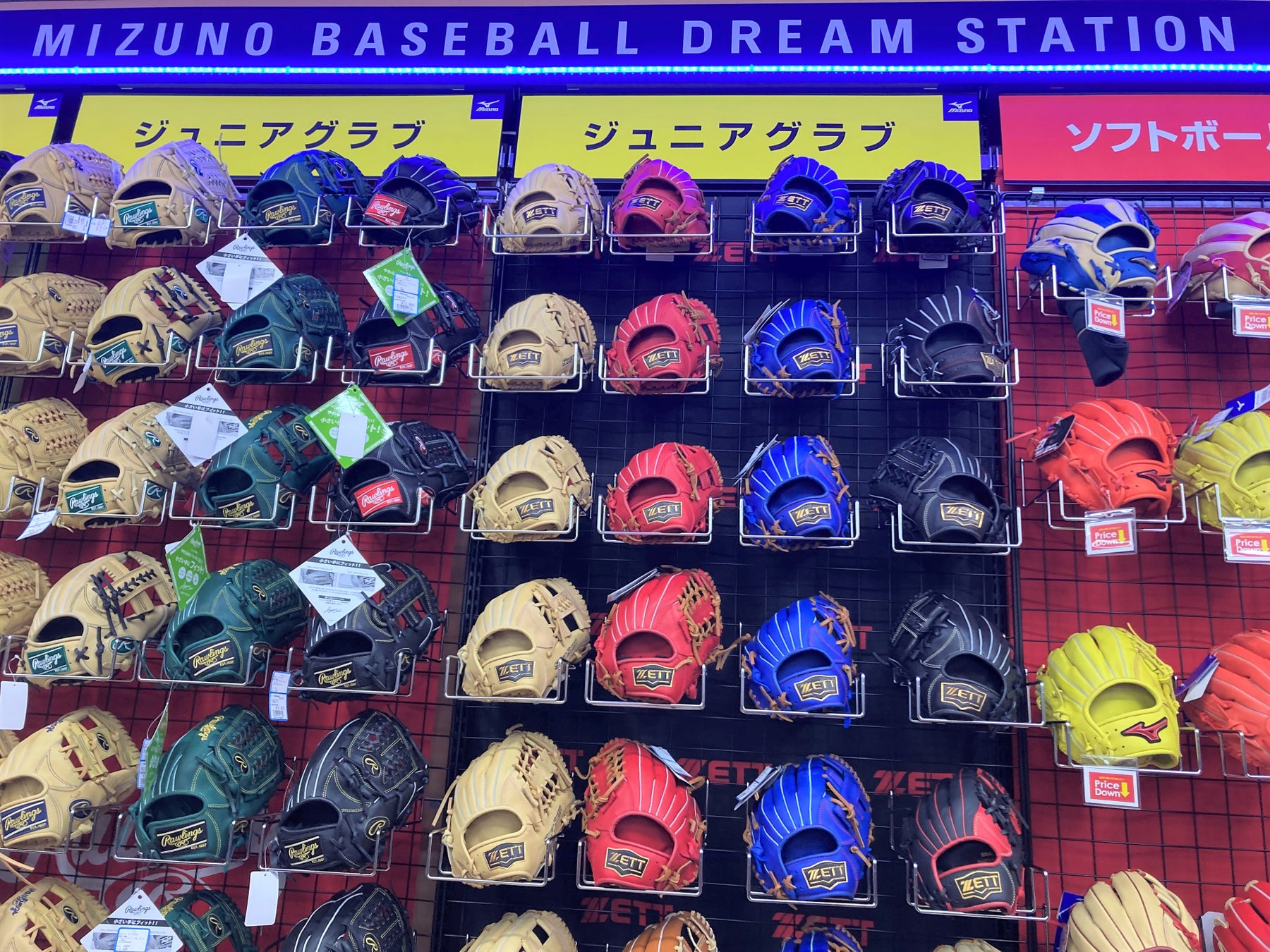 野球売場は、ミズノエキスパートリペアマンの資格を保有するプロスタッフ堀内が担当します。グラブトントン機や刺繍機などの加工機材も充実、基本加工から修理、細かな調整まで幅広く対応します。商品は、硬式用品からジュニアモデルまで幅広くラインナップ。店内ケージでは、練習器具の体験や硬式・軟式・ジュニアのバット試打もできます。
