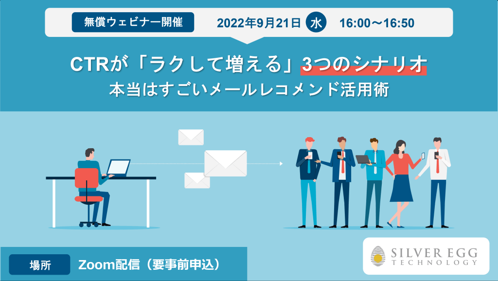 AI技術をベースとしたデジタルマーケティングサービスを提供するシルバーエッグ・テクノロジー株式会社(本社:大阪府吹田市、代表取締役社長&CEO:トーマス・フォーリー、証券コード 3961)は、2022年9月21日(水)にECサイトおよびメールマガジン運用担当者の皆様を対象にしたウェビナー「CTRが『ラクして増える』3つのシナリオ:本当はすごいメールレコメンド活用術」を開催いたします。