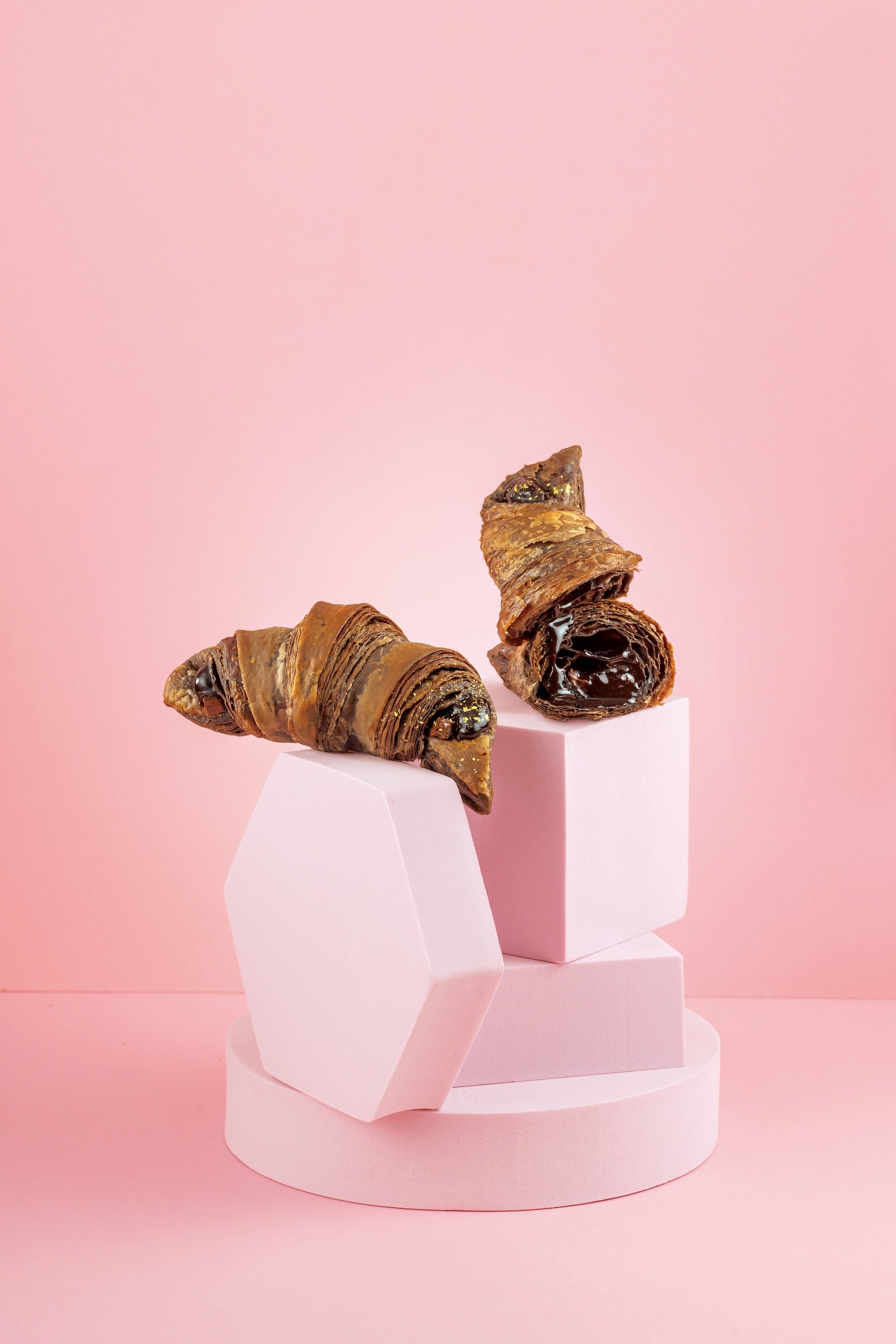 今回、『私のためのバレンタイン』がテーマなこともあり贅沢で濃厚なチョコレートを味わってもらいたいという想いから、生地自体にもココアを練りこみました。生地自体に何かを練りこむのは今回のプレミアムチョコクロが初めてです。クロワッサン生地のサクサク食感はそのままに、ココアの風味も楽しめる特別な生地を使用しています。その生地の中には、チョコレート とほんのりビターなガナッシュをたっぷり詰めこみ、甘くとろけるくちどけの中にビターのより濃厚なカカオの味わいを楽しんでいただけます。生地の上部に散りばめた金粉は、キラキラと光るゴージャスな贅沢さを演出しています。