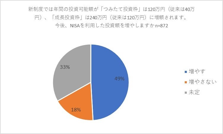 続いて、「新制度では年間の投資可能額が『つみたて投資枠』は120万円(従来は40万円)、『成長投資枠』は240万円(従来は120万円)に増額されます。今後、NISAを利用した投資額を増やしますか」と尋ねたところ、「増やす」との回答が49パーセントでトップとなりました。以下、「未定」が33パーセント、「増やさない」が18パーセントで続きました。